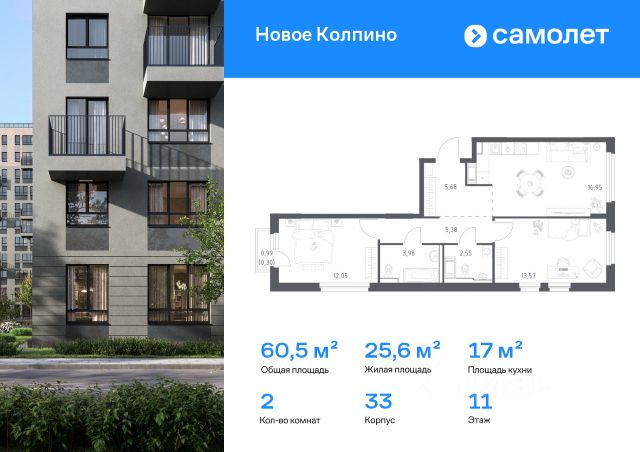 Строим кварталы для жизни с заботой о будущем. Предлагается 2-комнатная квартира комфорт-класса 60,02 кв.м в корпусе 35.2 на 11 этаже, в ЖК "Новое Колпино"