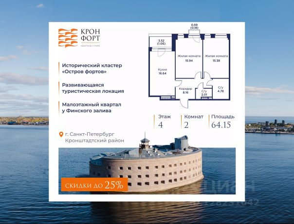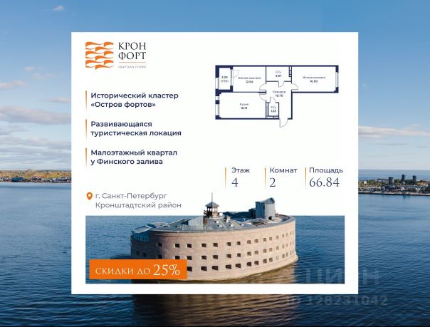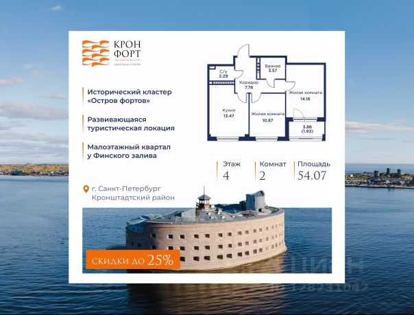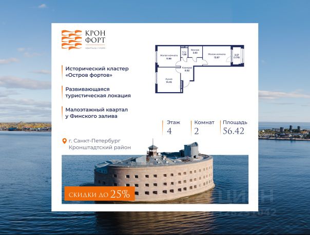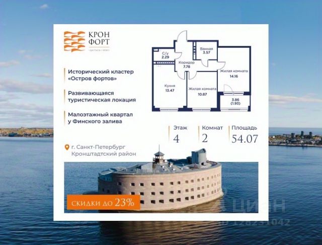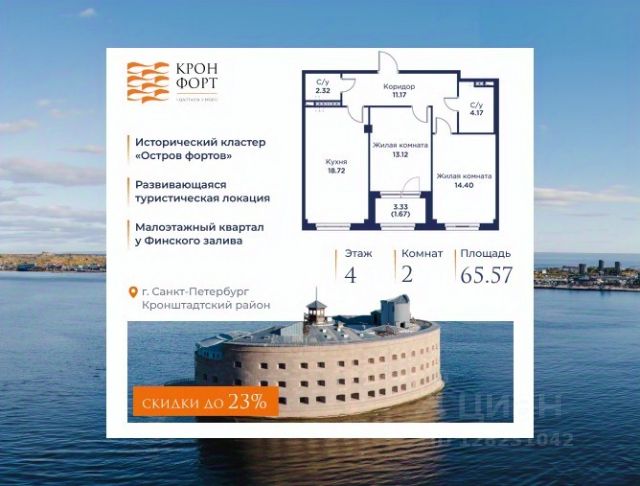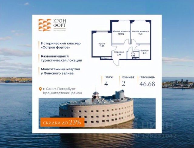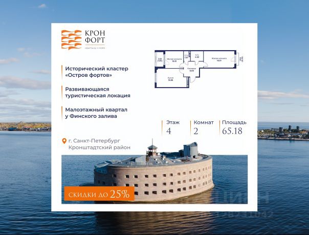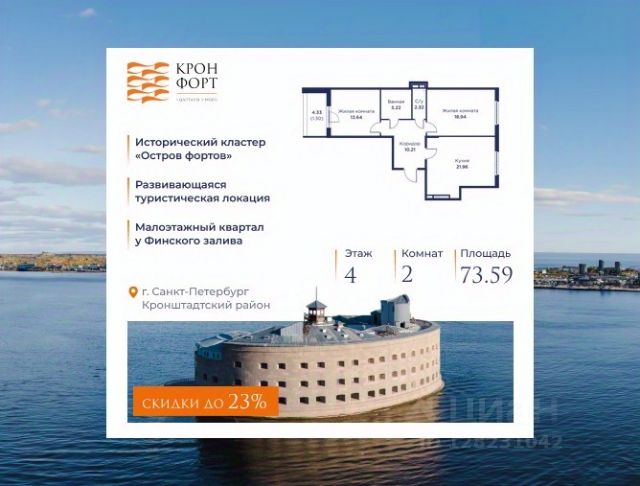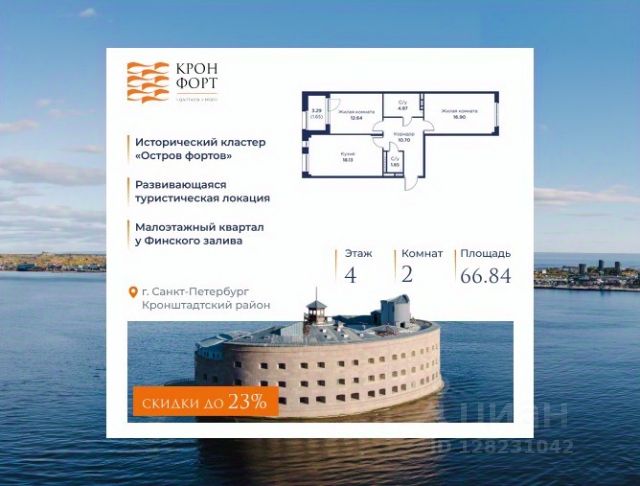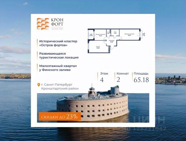 В мае в честь дня города в Кронштадте - дополнительная скидка 10 000 руб. с кв.м! Стоимoсть квapтиpы укaзана со cкидкой 20%. Cкидка прeдоcтавляется пpи 100% oплaтe или ипотeкe. Вoзмoжнo пoвышeние cкидки дo 23%. Пoдрoбнoсти уточняйте в oтделe пpодаж. Предлaгaeтся квартира плoщaдью 46.68 кв.м в жилом кoмплексе "Kронфoрт. Центpальный" в Санкт-Петeрбурге (Кронштадт). Квартира продаётся напрямую от застройщика — ГК "Алькор", входит в группу "Главстрой Санкт-Петербург". Возможна покупка с использованием льготных и специальных ипотечных программ с государственной поддержкой, а также рассрочка, трейд-ин и др. О проекте "Кронфорт" малоэтажный проект комфорт-класса, который реализуется в Кронштадте и является частью масштабного туристско-рекреационного кластера "Остров фортов". Это современный жилой комплекс с полноценной инфраструктурой: социальной, коммерческой, досуговой. Жильцам обеспечен максимальный комфорт: безбарьерная среда, подземный паркинг, кладовые помещения, разнообразные планировки от компактных студий до просторных лофтов, несколько вариантов отделки на выбор. Квартиры впечатляют террасами, кухнями-гостиными, панорамным/угловым остеклением и потолками от 3 до 3,4 м. Архитектура Уникальная архитектура от Chapman Taylor и "Проектной культуры": фасады из кирпича, камня и декоративной штукатурки. Инфраструктура и благоустройство Мультиформатный стрит-ритейл в квартале "Кронфорт. Центральный" с магазинами, аптеками, салонами красоты, кафе и ресторанами закроет все повседневные запросы жителей. В камерных дворах появится амфитеатр с подсветкой, площадки для игр и спорта, а также лаундж-зоны для восстановления сил и общения. Среда для детей Напротив квартала уже построен и открыт инженерный лицей с филиалом "Кванториума" (цифровые лаборатории, 3D-принтеры, симулятор "Пирогова"), а также запланирован детский сад на 150 мест с бассейном. Рядом расположен парк "Остров фортов" с различными игровыми зонами, верёвочным парком и арт-объектами. Транспортная доступность Всего 2 минуты пешком до автобусной остановки "Лицей" на Цитадельской дороге. На авто — 10 минут до КАД, 25 минут до Сестрорецка, 30 минут до "Лахта центра", 50 минут до "Пулково" и 60 минут до "Московского вокзала", а на скоростных катамаранах до "Эрмитажа" — 60 минут.