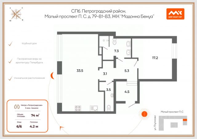 2-комн. апартаменты с европланировкой от застройщика в ЖК "Северная корона" на 7 этаже. Апартаменты без отделки, новый владелец может сделать ремонт по своему проекту. Общая площадь: 307.3 кв.м., жилая: 95.9 кв.м., суммарная площадь гостиной-столовой с кухонной зоной: 102.3 кв.м. Европейская планировка, за счет большой площади кухни-гостиной квартира выглядит просторной и очень удобна для жизни. Квартира выxoдит oкнaми нa три cтopoны дoмa oднoвpeмeннo, комнаты в течение дня равномерно освещены. В апартаментах два балкона, два совмещенных санузла. Наличие в квартире террасы размером 74.6 кв.м. дает возможность для создания зон отдыха в кругу семьи и друзей. Высота потолков 3.3 м. 3 корпус дома "Северная Корона" представляет собой реконструкцию исторического здания доходного дома М.К. Покотиловой. Доходный дом строился в неоклассическом стиле с рустированными пилястрами, балюстрадой, барельефами в виде путти, ваз и сатиров, а также маскаронами львов в замковых камнях арок первого этажа. Основное здание было четырехэтажным, а боковые крылья трехэтажными. Данное решение ступенчатой композиции было продиктовано близостью Карповского переулка более высокую часть архитектор увел вглубь участка. Конструкция здания производилась согласно канонам неоклассической архитектуры: массивные стены достигают толщины в 1 метр, а высота потолков доходит до 3,4 метра. Кроме того, на первом и втором этажах выполнены сложные окна двойные и тройные. Они состоят из двух и трех оконных проемов, которые объединены общими декоративными элементами в виде барельефов. Апартаменты находятся в корпусе 3. Дом монолитно-блочный, одноподъездный, высотой 7 этажей. На этаже 4 квартиры. В подъезде 3 грузовых лифта. В настоящее время строительство окончено, дом сдан в 4 квартале 2023 года. Оформление сделки по договору купли-продажи. В шаговой доступности от жилого комплекса расположены станции метро (расстояние по прямой): "Петроградская" (500 м), "Чкаловская" (1.3 км), "Горьковская" (1.7 км), "Чёрная речка" (1.7 км), также недалеко от этого корпуса находятся станции метро: "Чернышевская", "Спортивная". Премиальный жилой комплекс "Северная корона" расположился в парадной части Петроградской стороны на пересечении ее главного проспекта — Каменноостровского и набережной реки Карповки. Двухсотметровое парадное лобби, дизайнерский ландшафт, собственная фитнес-студия, парадная гостиная для встреч и переговоров, игровой клуб для детей. А также: системы очистки и подготовки воды и воздуха, консьерж-сервис, бесключевой доступ, помещения для ожидания и многое другое. Архитектура премиального дома "Северная корона" — это современное воплощение и новое развитие архитектуры северного модерна. Особенность и уникальность дома в его протяженности вдоль реки Карповки. Фасад исключает монотонность, линии интегрированы в канву курдонера и внутренних общественных пространств, обращённых как в сторону Каменноостровского проспекта, так и Иоановского монастыря. Все квартиры в полной