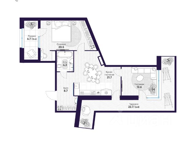 -Площадь просторной кухни-столовой: 20.87 кв.м.