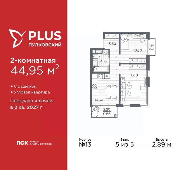 Двухкомнатная квартира с отделкой в ЖК "PLUS Пулковский" на 5 этаже. Общая площадь: 48.8 кв.м., жилая: 23.8 кв.м., площадь просторной кухни-столовой: 10.6 кв.м. Квартира угловая, идеально подойдет любителям тишины и панорамных видов. В квартире два балкона, один совмещенный санузел. Высота потолков 2.89 м. Дом монолитный, трехподъездный, высотой 5 этажей. Квартира находится в 1-й секции в корпусе 14. На этаже 6 квартир. В подъезде 1 грузовой лифт. Начало строительства - 1 квартал 2026 года. Окончание строительства - 2 квартал 2027 года. Оформление сделки по договору долевого участия. Уютный пятиэтажный city квартал PLUS Пулковский расположен в престижном Московском районе на пересечении Пулковского и Волхонского шоссе в новом формирующемся микрорайоне. Рядом проходит одна из важнейших транспортных артерий города Пулковское шоссе, а в 10 минутах езды два въезда на КАД и въезд на ЗСД. Благодаря удобному и быстрому выезду на Пулковское шоссе, можно легко добраться до центра города за 35 мин. До станций метро "Московская" и "Купчино" - 15 мин. на машине, а до аэропорта Пулково - 17 мин. В составе квартала: 30 пятиэтажных домов, школа со спортивным стадионом, 2 детских сада с бассейнами, наземные и подземные паркинги, центральный зеленый бульвар с play hub и местами отдыха. Благоустройство квартала продумано до мельчайших деталей, в его основе - забота о качестве жизни каждого жителя. Дома возводятся по современной монолитной технологии строительства с вентилируемыми фасадами. Благодаря большим увеличенным окнам и отсутствию высокоэтажных домов, во всех квартирах максимальный объем естественного света. В составе квартала запланированы социально-значимые объекты: школа на 825 мест со спортивным стадионом и бассейнами, два детских сада с бассейнами на 220 мест каждый. Территория квартала зонирована таким образом, чтобы автомобильные и пешеходные потоки и не пересекались. Прогулочные и велосипедные дорожки отделены от автомобильных проездов зелеными насаждениями. Дворы закрыты для машин, что дает чувство дополнительной безопасности для жителей особенно, для самых маленьких. Вся территория квартала безбарьерная. Здесь нет пандусов, резких перепадов высот или неудобных ступеней. Вход в парадные с уровня земли. В каждом дворе есть своя оборудованная детская площадка. А в центре микрорайона расположится большая игровая площадка play hub с пространством для командных игр. PLUS Пулковский располагается в молодом микрорайоне, который сейчас находится в стадии активного развития. Он будет обладать собственной развитой инфраструктурой. В радиусе 15 минут езды на автомобиле располагаются многочисленные магазины, супермаркеты, спортивные, образовательные и медицинские учреждения, парки и достопримечательности. Для автомашин предусмотрены отдельно стоящий 5-ти этажный паркинг на 958 машино-мест, две подземные парковки на 367 машино-мест и наземные парковочные зоны по внешнему периметру микрорайона. #2mf3lB