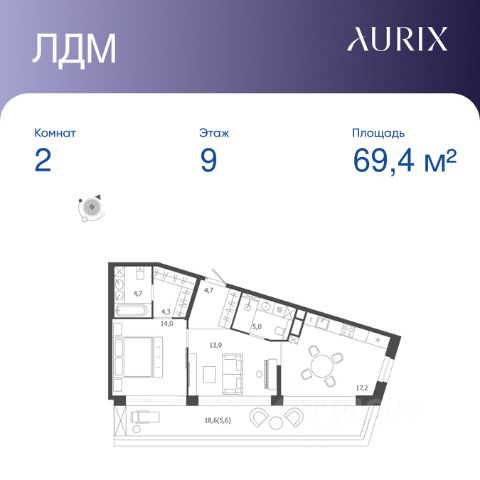 Продается 2-к квартира без отделки в ЖК "ЛДМ". Общая площадь квартиры — 69.4 кв. м, этаж 9 из 9. Тип дома — монолитный. Цена указана при 100% оплате. Описание из материнского фида