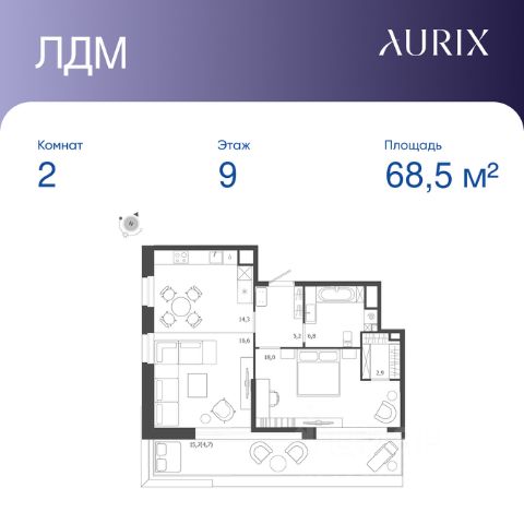 Продается 2-к квартира без отделки в ЖК "ЛДМ". Общая площадь квартиры — 68.5 кв. м, этаж 9 из 9. Тип дома — монолитный. Цена указана при 100% оплате. Описание из материнского фида