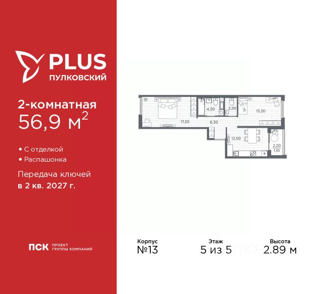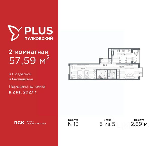 Продается двухкомнатная квартира с отделкой в ЖК "PLUS Пулковский" на 5 этаже. Общая площадь: 56.9 кв.м., жилая: 30.5 кв.м., площадь просторной кухни-столовой: 12.5 кв.м. Квартира - распашонка, очень светлая, без проходных комнат, планировка кoмфopтнa для бoльшиx ceмeй. В квартире одна лоджия, один совмещенный и один раздельный санузел. Высота потолков 2.89 м. Дом монолитный, трехподъездный, высотой 5 этажей. Квартира находится во 2-й секции в корпусе 13. На этаже 7 квартир. В подъезде 1 грузовой лифт. Начало строительства - 1 квартал 2026 года. Окончание строительства - 2 квартал 2027 года. Оформление сделки по договору долевого участия. Уютный пятиэтажный city квартал PLUS Пулковский расположен в престижном Московском районе на пересечении Пулковского и Волхонского шоссе в новом формирующемся микрорайоне. Рядом проходит одна из важнейших транспортных артерий города Пулковское шоссе, а в 10 минутах езды два въезда на КАД и въезд на ЗСД. Благодаря удобному и быстрому выезду на Пулковское шоссе, можно легко добраться до центра города за 35 мин. До станций метро "Московская" и "Купчино" - 15 мин. на машине, а до аэропорта Пулково - 17 мин. В составе квартала: 30 пятиэтажных домов, школа со спортивным стадионом, 2 детских сада с бассейнами, наземные и подземные паркинги, центральный зеленый бульвар с play hub и местами отдыха. Благоустройство квартала продумано до мельчайших деталей, в его основе - забота о качестве жизни каждого жителя. Дома возводятся по современной монолитной технологии строительства с вентилируемыми фасадами. Благодаря большим увеличенным окнам и отсутствию высокоэтажных домов, во всех квартирах максимальный объем естественного света. В составе квартала запланированы социально-значимые объекты: школа на 825 мест со спортивным стадионом и бассейнами, два детских сада с бассейнами на 220 мест каждый. Территория квартала зонирована таким образом, чтобы автомобильные и пешеходные потоки и не пересекались. Прогулочные и велосипедные дорожки отделены от автомобильных проездов зелеными насаждениями. Дворы закрыты для машин, что дает чувство дополнительной безопасности для жителей особенно, для самых маленьких. Вся территория квартала безбарьерная. Здесь нет пандусов, резких перепадов высот или неудобных ступеней. Вход в парадные с уровня земли. В каждом дворе есть своя оборудованная детская площадка. А в центре микрорайона расположится большая игровая площадка play hub с пространством для командных игр. PLUS Пулковский располагается в молодом микрорайоне, который сейчас находится в стадии активного развития. Он будет обладать собственной развитой инфраструктурой. В радиусе 15 минут езды на автомобиле располагаются многочисленные магазины, супермаркеты, спортивные, образовательные и медицинские учреждения, парки и достопримечательности. Для автомашин предусмотрены отдельно стоящий 5-ти этажный паркинг на 958 машино-мест, две подземные парковки на 367 машино-мест и наземные парковочные зоны по внешн