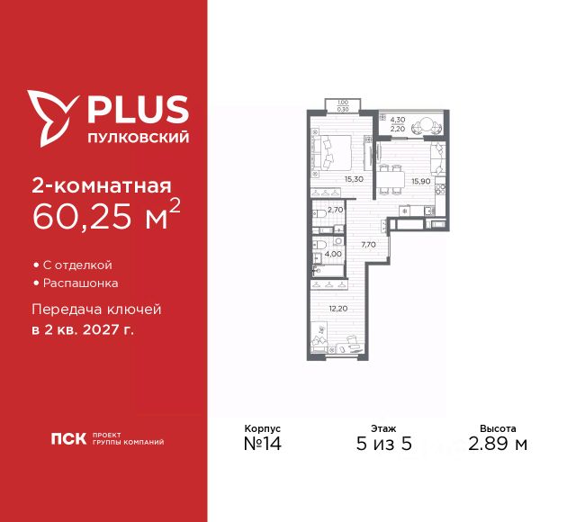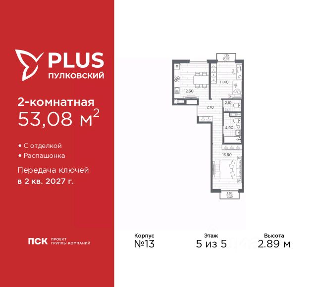 2-комн. квартира от застройщика с отделкой в ЖК "PLUS Пулковский" на 5 этаже. Общая площадь: 56.9 кв.м., жилая: 30.5 кв.м., площадь просторной кухни-столовой: 12.5 кв.м. Квартира - распашонка, без проходных комнат, окна выходят на paзные стороны дома. В квартире одна лоджия, один совмещенный и один раздельный санузел. Высота потолков 2.89 м. Дом монолитный, трехподъездный, высотой 5 этажей. Квартира находится во 2-й секции в корпусе 13. На этаже 7 квартир. В подъезде 1 грузовой лифт. Начало строительства - 1 квартал 2026 года. Окончание строительства - 2 квартал 2027 года. Оформление сделки по договору долевого участия. Уютный пятиэтажный city квартал PLUS Пулковский расположен в престижном Московском районе на пересечении Пулковского и Волхонского шоссе в новом формирующемся микрорайоне. Рядом проходит одна из важнейших транспортных артерий города Пулковское шоссе, а в 10 минутах езды два въезда на КАД и въезд на ЗСД. Благодаря удобному и быстрому выезду на Пулковское шоссе, можно легко добраться до центра города за 35 мин. До станций метро "Московская" и "Купчино" - 15 мин. на машине, а до аэропорта Пулково - 17 мин. В составе квартала: 30 пятиэтажных домов, школа со спортивным стадионом, 2 детских сада с бассейнами, наземные и подземные паркинги, центральный зеленый бульвар с play hub и местами отдыха. Благоустройство квартала продумано до мельчайших деталей, в его основе - забота о качестве жизни каждого жителя. Дома возводятся по современной монолитной технологии строительства с вентилируемыми фасадами. Благодаря большим увеличенным окнам и отсутствию высокоэтажных домов, во всех квартирах максимальный объем естественного света. В составе квартала запланированы социально-значимые объекты: школа на 825 мест со спортивным стадионом и бассейнами, два детских сада с бассейнами на 220 мест каждый. Территория квартала зонирована таким образом, чтобы автомобильные и пешеходные потоки и не пересекались. Прогулочные и велосипедные дорожки отделены от автомобильных проездов зелеными насаждениями. Дворы закрыты для машин, что дает чувство дополнительной безопасности для жителей особенно, для самых маленьких. Вся территория квартала безбарьерная. Здесь нет пандусов, резких перепадов высот или неудобных ступеней. Вход в парадные с уровня земли. В каждом дворе есть своя оборудованная детская площадка. А в центре микрорайона расположится большая игровая площадка play hub с пространством для командных игр. PLUS Пулковский располагается в молодом микрорайоне, который сейчас находится в стадии активного развития. Он будет обладать собственной развитой инфраструктурой. В радиусе 15 минут езды на автомобиле располагаются многочисленные магазины, супермаркеты, спортивные, образовательные и медицинские учреждения, парки и достопримечательности. Для автомашин предусмотрены отдельно стоящий 5-ти этажный паркинг на 958 машино-мест, две подземные парковки на 367 машино-мест и наземные парковочные зоны по внешнему периметру микро