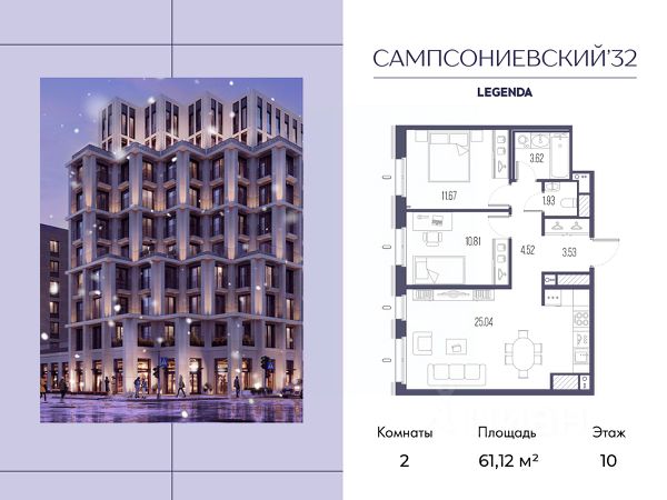 Квартира с двумя спальнями в комплексе "Сампсониевский 32" от LEGENDA на 7 этаже. -Общая площадь: 57.96 кв.м. -Жилая: 20.62 кв.м. -Площадь просторной кухни-столовой: 21.3 кв.м. -Высота потолков 2.7 м. Комнаты изолированные, все окна выходят на одну сторону. В квартире один совмещенный и один раздельный санузел. ЖК "Сампсониевский, 32" квартал бизнес-класса в Выборгском районе Санкт-Петербурга недалеко от набережной Большой Невки и Петроградской стороны. Отличают комплекс каскадные фасады с большой площадью остекления, видовые квартиры с террасами. Современные инженерные и технические решения, повышающие качество жизни TechnoBox включают в себя: стационарный и удаленный контроль дома, систему Air Design, обеспечивающую чистый воздух без лишнего шума, мультисервисную сеть, объединяющую коммуникационные системы. Квартиры сдаются с предчистовой отделкой: выровнены пол и стены, проведена электрика, предусмотрена шумоизоляция, встроенная система вентиляции. В каждой квартире установлена взломостойкая входная дверь, окна со специальным термоизолированным алюминиевым профилем. В ЖК "Сампсониевский, 32" много вариантов планировок: квартиры с террасой, мастер-спальней, ванной комнатой с окном, гардеробной комнатой. Двор закрыт от транспорта, здесь будут зоны с дизайнерским оформлением для игр и отдыха. Срок сдачи 4 квартал 2026 года. В отапливаемом подземном паркинге 298 мест, спуститься туда можно на лифте из своей квартиры. Комплекс находится на границе крупных районов, рядом с набережными, которые ведут в Приморский, Калининский и Центральный районы, а через Сампсониевский, Гренадёрский и Кантемировский мосты можно попасть в Петроградский район. До станции метро "Выборгская" 900 м, до станции метро "Петроградская" 2,6 км. Финляндский вокзал находится в 2,5 км от ЖК, а Западный скоростной диаметр (ЗСД) в 10 км. Рядом с ЖК находится несколько гимназий, общеобразовательных школ и детских садов. Здесь много медицинских учреждений, кафе, ресторанов, торговых центров, гипермаркетов. Меньше чем в 1 км от ЖК Сампсониевский и Выборгский сады, а в 2 км находится Ботанический сад, набережная реки Карповки с качелями и зонами отдыха у воды.