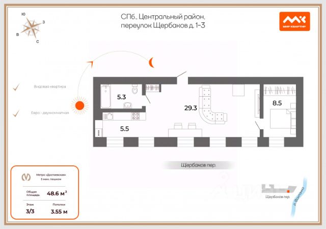 ID: 1915754 Двухкомнатная квартира в доме с капремонтом. Отличное состояние стен, полов и потолка. Высокие потолки - 3,3 м, большие окна - в квартире много воздуха и света. Большая кухня, раздельный санузел, есть возможность сделать второй санузел на месте кладовки в коридоре. Окна кухни выходят во двор, квартира двухсторонняя. Окна широких, правильной формы комнат выходят в тихий переулок Щербакова, по которому за 5 минут можно дойти до метро Владимирская или Достоевского. В парадной чисто. Дом с железобетонными перекрытиями., на первом и втором этаже расположен детский садик, вход в него не с нашей парадной, но благодаря его наличию, включение отопления, и все коммунальные аварии решаются вне очереди. Вход со стороны просторного двора между Рубинштейна 21 и Рубинштейна 23 - Довлатовский дом. Двор охраняемый, закрытый для проезда, но машины собственники ставят. Рядом МДТ - театр Европы и театр Зазеркалье, Владимирский пассаж. Вокруг много магазинчиков, кафе и ресторанов. До Невского проспекта минут 10 спокойным шагом. Квартира в прямой продаже, подходит под ипотеку, полная стоимость в договоре, 2 взрослых собственника, никто не проживает.
