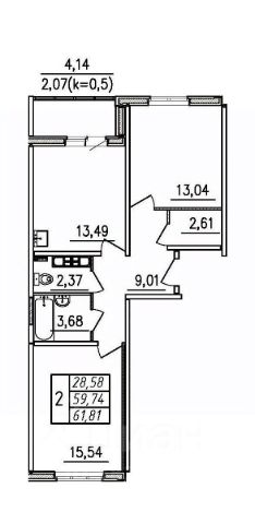 -Общая площадь 54, 0 кв. м. , кухня 14, 1 кв. м. , жилые комнаты правильной формы 13, 7+13, 5 кв. м. сан. узел раздельный, просторная ванная 3, 5 кв. м. , большой застекленный балкон 5, 5 кв. м. со стороны кухни, который не входит в общую площадь квартиры, вместе с балконом площадь квартиры под 60, 0 кв. м.