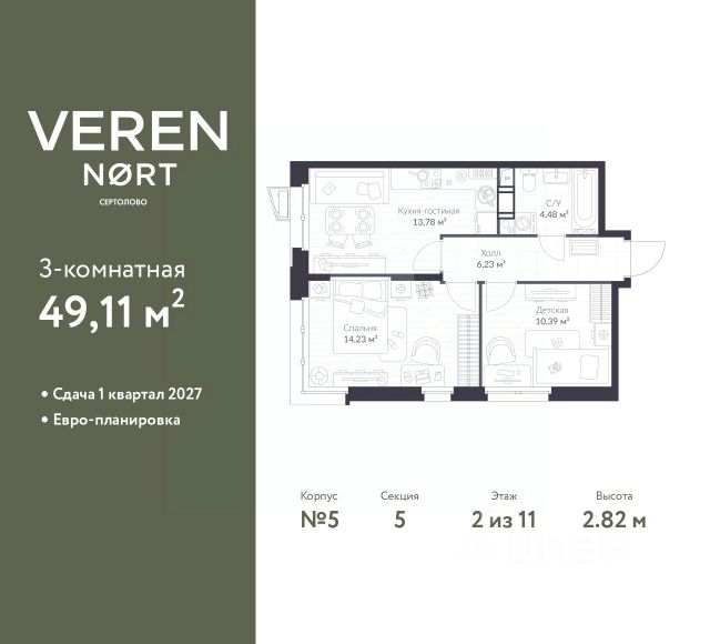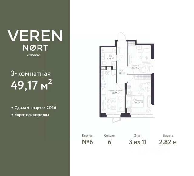 Спешите забронировать по акционной цене! Срок предложения ограничен! Стоимость квартиры указана со скидкой, ваша экономия составит 822,732 RUB. По всем вопросам звоните в офис продаж, наши менеджеры вам все расскажут! 2-комн. квартира в Veren Nort Сертолово на 5 этаже. Квартира без отделки, полностью готова к чистовой отделке и дальнейшему ремонту. Общая площадь: 45.03 кв.м., жилая: 21.99 кв.м., площадь просторной куxни-гостиной: 11.43 кв.м. Квартира угловая, очень светлая, естественная вентиляция при открытии окон. В квартире один балкон, один совмещенный санузел. Высота потолков 2.82 м. Квартира находится в корпусе 7. Дом монолитный, одноподъездный, высотой 11 этажей. На этаже 14 квартир. В подъезде 1 пассажирский и 1 грузовой лифт. Окончание строительства - 4 квартал 2026 года. Оформление сделки по договору долевого участия. С балконом, вид на приватный двор. Сочетание современной архитектуры и отличной экологии севера Лен. области. Выразительный облик домов разработан именитым архитектурным бюро "Остоженка". Характеристики жилого комплекса исключительны: продуманный ландшафтный дизайн, оригинальные парадные, разработанные по индивидуальному дизайн-проекту, современные детские и многофункциональные спортивные площадки, летний кинотеатр под открытым небом, два детских сада. Комплекс создается в уже сложившейся инфраструктуре г. Сертолово и обладает удобным транспортным сообщением с Санкт-Петербургом. В 300 метрах от "VEREN NORT сертолово" планируется транспортно-пересадочный узел "Сертолово", который обеспечит удобную железнодорожную связь с Финляндским вокзалом Санкт-Петербурга. #24Em7v Купить 2-комнатную квартиру до 8 млн. рублей в Сертолово.