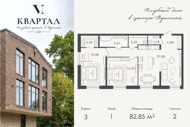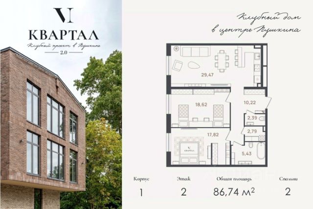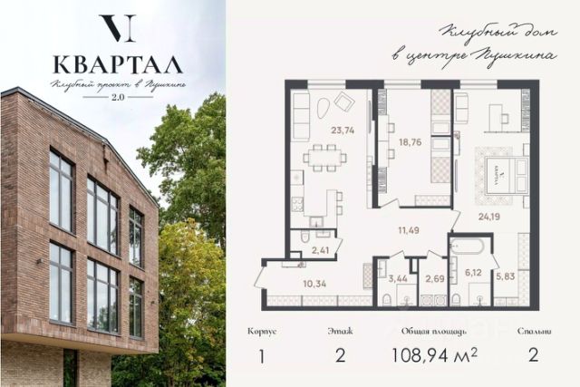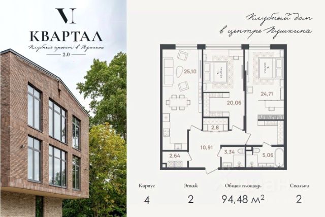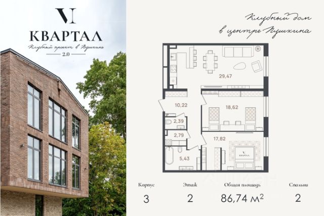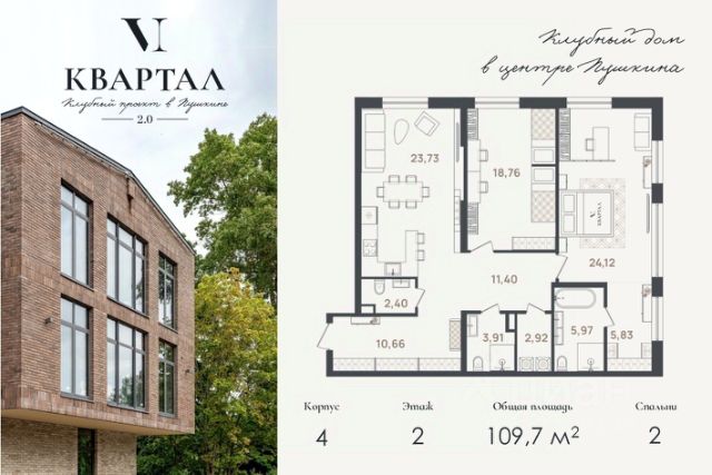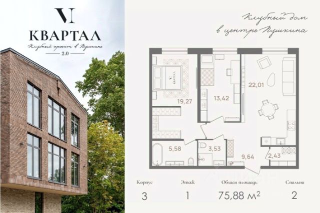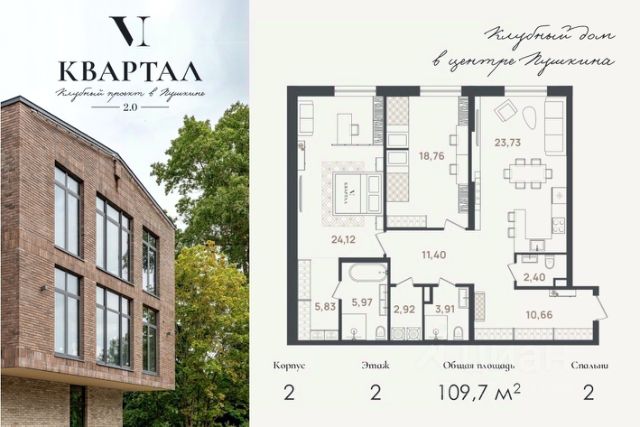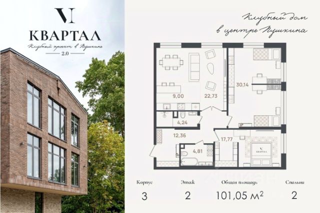 В продаже квартира 101,05 кв.м, расположенная на 2 этаже 3 этажного корпуса. Планировкой предусмотрены кухня-гостиная площадью 22,73 кв.м и кухня 9,0 кв.м., просторная детская для двух детей, спальня площадью 17,77 кв.м с собственной гардеробной. В холле место для системы хранения, гостевой с/у, постирочная. Высота потолка 3м, панорамные окна.