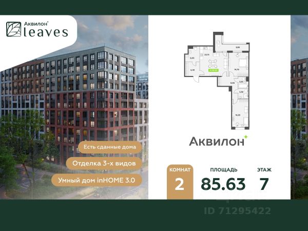 Купи квартиру в ЖК "Аквилон Leaves"! Отделка В квартире выполнена предчистовая отделка WhiteBox +Возможен дозаказ отделки в любом из 3 цветов: SAND, TERRA, GRAPHITE Отделка входит в стоимость квартиры в ДДУ ЖК "Аквилон Leaves" Жилой комплекс класса бизнес-лайт "Аквилон Leaves" воплощает идеальную синергию природы, технологий и дизайна. В одном из самых престижных районов Санкт-Петербурга мы создаем функциональную жилую среду, которая позволит максимально быстро и удобно решать бытовые вопросы, сохраняя ценное время для семьи и любимых занятий. -Малошумные лифты -Сквозные парадные -Светопрозрачные входные группы -Увеличенная высота первого этажа -Безбарьерная среда -Подземный паркинг Стандарты Группы Аквилон для вашей комфортной жизни Thermo-S экономия на коммунальных платежах за счет дополнительно утепленных стен, кровли и цоколя. Энергоэффективные окна с селективным покрытием и аргоновым заполнением Soundstop - дополнительная шумоизоляция внутренних перегородок и межэтажных перекрытий, шумозащитные окна, малошумные лифты Light-in - в квартирах устанавливаются широкоформатные окна, увеличены на 30%. Высота подоконников на уровне 60 см от пола. Vent-in - в каждой комнате есть клапаны индивидуальной вентиляции, которые обеспечивают приток свежего воздуха с улицы. inHOME умный дом в каждой квартире Интеллектуальная цифровая система, которая позволит дистанционно решать бытовые вопросы, управлять квартирой и экономить на оплате коммунальных услуг. В состав inHOME входят: IP-домофон, Face key, "умные" счетчики, датчики протечки, дистанционное отключение розеток, и т.д. Двор ваш личный парк Благоустройство двора от студии ландшафтного дизайна MEGABUDKA отсылает нас к образу зеленого листа. Современная архитектура гармонирует с окружающей средой, а экологические стандарты и "умные" системы обеспечивают ежедневный комфорт. -Зонирование на площадки для активного и спокойного отдыха. -Ландшафт с геопластикой и рельефом напоминает естественную красоту природных парков. -Всесезонные растения -Высаживаются взрослые деревья и кустарники Локация и инфраструктура Помимо разнообразной инфраструктуры, рядом с комплексом расположен Пулковский парк и сад "Дубовая роща". У жителей будут все возможности для отдыха на свежем воздухе. Велопрогулка, пробежка или летний пикник наслаждайтесь природой, не уезжая далеко загород. -10 мин. до м. Московская -15 мин. до м. Звездная -15 мин. до аэропорта Пулково -30 мин. до Невского пр. #2megcb