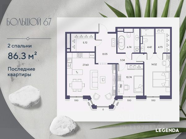 2-комн. квартира от застройщика с предчистовой отделкой в ЖК "Большой, 67" на 8 этаже. Общая площадь: 83.9 кв.м., жилая: 25.26 кв.м., площадь просторной кухни-столовой: 24.8 кв.м. Комнаты изолированные, все окна выходят на одну сторону. В квартире один балкон, два совмещенных санузла. Терраса представляет собой роскошную зону отдыха, где вы на свой вкус можете создать атмосферу комфорта и уюта. Высота потолков 2.98 м.
