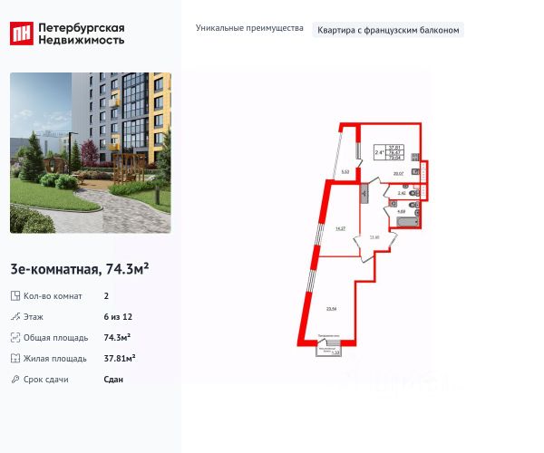 Продается просторная 2-комнатная квартира от застройщика в жилом комплексе "Прайм Приморский" в динамичном Приморском районе. До метро можно добраться на транспорте всего за 15 минут. Мастер-спальня с собственной ванной комнатой. Самое приватное пространство в вашей квартире. Уникальная, функциональная европланировка, большая кухня-гостиная 20.19 м², просторная прихожая 9.23 м². Общая площадь квартиры - 63.5 м², жилая 28.6 м², высота потолка 2.77 м. Квартира продается с отделкой "NORD LINE WHITE ВК". Что особенного в ЖК "Прайм Приморский"? • Живописные виды на Шуваловский карьер и лесной массив • "Парящие" французские балконы • Центральная входная группа • Креативное пространство в центре проекта, летняя терраса для отдыха • Приватные лаундж-зоны на крыше домов 2-комнатная квартира в готовой новостройке рядом с метро Старая Деревня.
