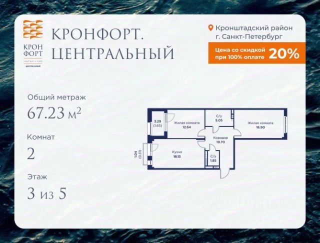 Стоимость квартиры указана со скидкой 20%. Скидка предоставляется при 100% оплате или несубсидированной ипотеке. Предлагается квартира площадью 46.68 кв.м в жилом комплексе "Кронфорт. Центральный" в Санкт-Петербурге (Кронштадт). Возможна покупка с использованием льготных и специальных ипотечных программ с государственной поддержкой. Высота потолков в квартирах — от 3 до 3,4 метров, окна увеличенного размера, есть варианты с эркерами, французскими балконами, лоджиями и террасами. Жилой квартал состоит из пяти четырехэтажных корпусов с закрытыми охраняемыми дворами, свободными от машин. Первые этажи формируют торговые променады в стиле пешеходных улиц исторической части Петербурга и Кронштадта. Внутренние пространства между корпусами — пешеходные зоны с уютными площадями. Архитектурный облик квартала разработан бюро "Проектная культура" и международной компанией Chapman Taylor. Инфраструктура комплекса включает: - Лицей с двумя бассейнами - Детский сад на 150 мест с бассейном и закрытой территорией - Веревочный парк - Игровые площадки для активного отдыха; - Кабинет врача общей практики. - Подземные паркинги с лифтами. - Мусоросборные камеры, индивидуальные кладовые. - Закрытые дворы с контролем доступа и видеонаблюдением. - Мультформатный стрит-ретейл с кафе и ресторанами. - Триатлон-центр и беговые/велодорожки. - Учебно-тренировочный комплекс для детей "Лагерь настоящих героев". Транспортная доступность обеспечивает удобный выезд на КАД (около 1-3 км), 2 минуты пешком до автобусной остановки "Лицей", 25 минут до Сестрорецка, 30 минут до "Лахта-центра", 50 минут до аэропорта "Пулково" и 60 минут до Московского вокзала. Для любителей моря доступен маршрут на "Метеоре" до центра Санкт-Петербурга. Отделка квартир предлагается как с готовой чистовой отделкой, так и со свободной планировкой без отделки для реализации индивидуальных дизайнерских решений. В третьем корпусе, продажи которого стартовали в марте 2025 года, доступны квартиры с просторными террасами, тремя балконами, кухнями-гостиными до 38 кв.м с окнами на две стороны, обеспечивающими панорамное освещение и виды. Если вам нужна помощь с оформлением ипотеки или дополнительная информация по комплексу и условиям покупки, обращайтесь в отдел продаж за консультацией. 2-комнатная квартира в ипотеку в новостройке в Кронштадте.
