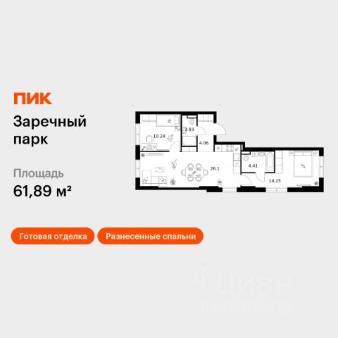 Продаётся 2-комн. квартира площадью 64,6 кв.м на 14 этаже 24 этажного дома (Корпус 6, Секция 1) проекта ПИК Заречный парк. Светлый просторный подъезд на уровне земли, функциональная планировка, большие окна, c отделкой. Жилой квартал "Заречный парк" расположен в районе Новое Девяткино Ленинградской области. В 7 минутах на автомобиле - станция метро "Девяткино", до КАД - 10 минут на машине. В 2026 году будет достроена шестиполосная трасса в обход Мурино, примыкающая к Пискарёвскому проспекту. Она станет дополнительным выездом на КАД для жителей "Заречного парка". Проект включает восемь домов высотой от 15 до 24 этажей, три многоуровневых паркинга, детский сад и школу. В зелёных дворах-парках будут оборудованы современные детские и спортивные площадки, обустроены места для отдыха. На первых этажах разместятся магазины, кафе и другие сервисы. Планировки продуманы так, чтобы каждый квадратный метр жилой площади можно было эффективно использовать. Все квартиры сдаются с готовой отделкой. Артикул 972988 (Застройщик ООО "СПЕЦИАЛИЗИРОВАННЫЙ ЗАСТРОЙЩИК ИНВЕСТАЛЬЯНС") [cn_sbp_1656597]