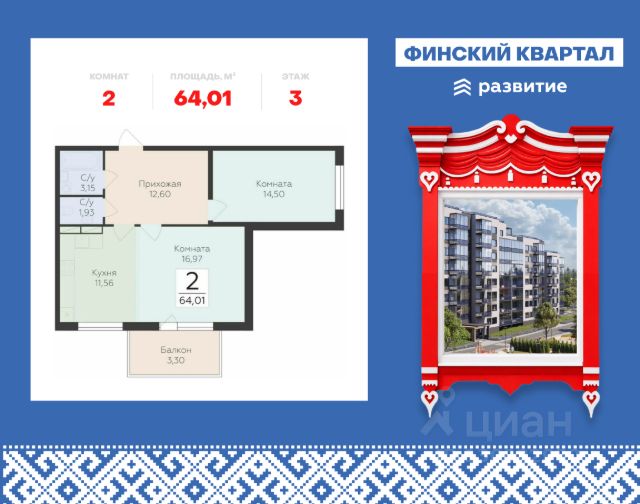 "Продается квартира площадью 56.05 кв. м с предчистовой отделкой. Квартира расположена на 2 этаже 8 этажного дома, в жилом комплексе комфорт-класса "Финский Квартал". "Финский квартал" - это уникальный проект комфорт-класса для тех, кто хотел бы жить на природе, но при этом находиться вблизи Северной столицы. Расположенный в окружении одного из самых крупных парков Ленобласти - Лахтинского, проект предлагает своим жителям доступную инфраструктуру, комплексное благоустройство территории, 6 секций переменной этажности с современной архитектурой, которая гармонично дополнит район и будет радовать проживающих еще много лет. Найдите свою идеальную квартиру в ЖК "Финский Квартал"! Расположение Пешком: - 5 мин. до детского сада и супермаркета; - 8 мин. до остановки "Зеленая улица"; - 10 мин. до лесопарковой зоны. На автомобиле: - 3 мин. до Приозерского шоссе; - 10 мин. до Выборгского шоссе; - 12 мин. до КАД; - 30 мин. до ст. метро "Проспект Просвещения". Благоустройство - большой яркий двор с ландшафтным дизайном; - живая изгородь, кустарники и хвойники; - умное зонирование тихих и активных площадок; - сквер для прогулок и отдыха; - изумрудные лужайки для пикников; - дорожки для пешеходов и велосипедистов; - большие игровые площадки; - мягкое покрытие для безопасности детей; - тренажеры, турники и веревочные комплексы; - пространство только для пешеходов - без машин; - наземная парковка за пределами двора; - специальные площадки для выгула питомцев; - светлые дизайнерские холлы; - светопрозрачное остекление и большие окна; - декоративная подсветка парадных; - колясочные помещения для комфорта родителей; - места для хранения велосипедов и самокатов. Окружение - свежий воздух: парк усадьбы "Осиновая Роща", Лахтинский парк, лесопарк "Курортный", Левашовский заказник, Ново-Кавголовский лесопарк; - водные объекты: Сестрорецкий Разлив, пляжи у Тохколодского и Большого озер, залив Сярюнлахти; - инфраструктура: 2 детских сада, школа, кафе, продуктовый супермаркет, больница; - для крупных покупок: ТРЦ "Китай-Город", "Мега-Парнас"", "Гранд Каньон"; - активный отдых: горнолыжные комплексы "Охта-Парк" и "Токсово", конный клуб "Осиновая Роща", ФОК "Норус"."