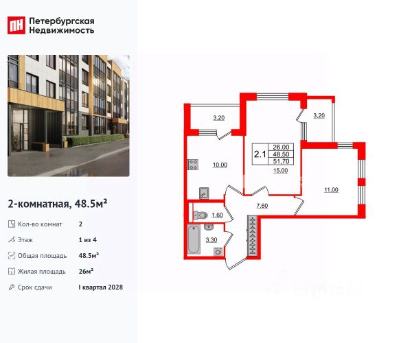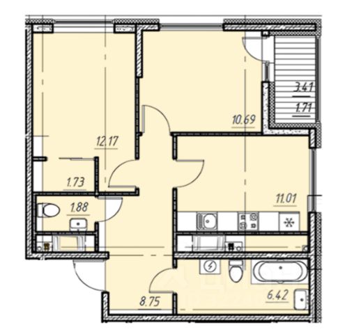 Площадь квартиры: 65,4 кв.м. + 3,6 кв.м лоджия