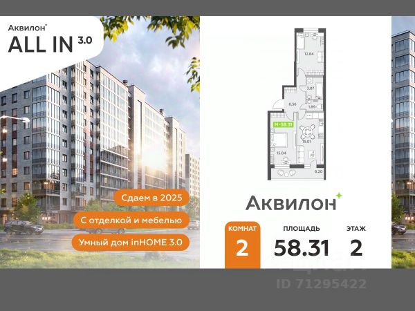Эргономичная планировка: кухня-гостинная - 19,5 кв.м с выходом на балкон 3,6 кв.м., две квадратная комната 14,3+14,3 кв.м.