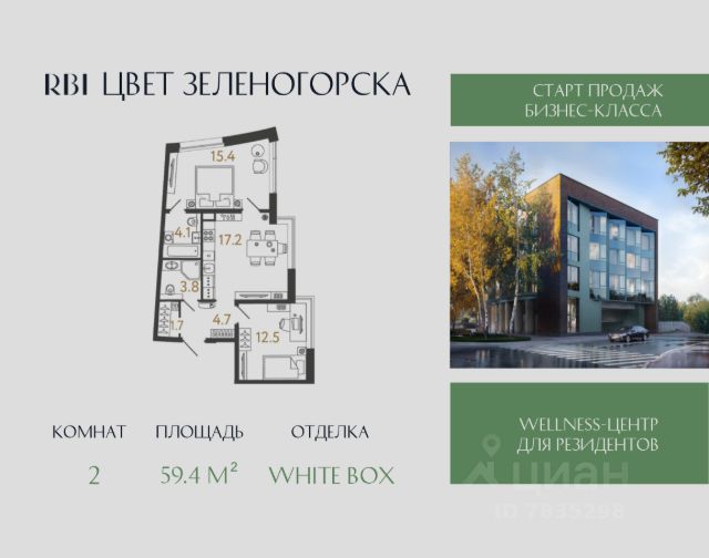 "Цвет Зеленогорска" — курорт блистательных людей от RBI на северном побережье Финского залива. Камерный дом бизнес-класса на 94 квартиры строится в Курортном районе Санкт-Петербурга в городе Зеленогорск на проспекте Ленина, 38. Отсюда рукой подать до Зеленогорского парка культуры и знаменитого Золотого пляжа с песчаными дюнами. До железнодорожной станции, куда за полчаса можно доехать на "Ласточке" от Финляндского вокзала, пешком 10 минут. Архитектура дома воплощает гениальную пластику модерна в современном прочтении. Изящный фасад визуально созвучен изгибу Жемчужного ручья, к которому плавно спускается приватный двор. В едином "волнообразном" корпусе — 4 секции по 4 этажа. В каждой — от 18 до 27 квартир: особая привилегия жить в комьюнити близких по духу людей. Квартирография камерная, но универсальная. Есть уютные студии и однокомнатные, куда курортным летом можно переезжать самим или сдавать в аренду и получать доход. Для любителей эстетики с нотками ностальгии — квартиры с французскими балконами и окном в ванной. Для тех, кто рассматривает квартиру как альтернативу загородному дому — большие двусторонние трёх- и четырёхкомнатные квартиры с кухней-гостиной и террасой для неспешных завтраков и уютных семейных вечеров. Лоты на типовых этажах — с потолками 2,99 м, на четвёртом этаже — 3,14 м. Все квартиры продаются с отделкой White Box. В приватном сквере у ручья среди малиновых спирей, душистых сиреней и ароматных хвойных деревьев легко сбежать от навязанных сценариев жизни, уделить внимание действительно важному и обрести подлинную гармонию. Во дворе появится деревянный амфитеатр для встреч, дискуссий и самовыражения, воздушная пергола с абажурами для уединённого общения, экологичные скамейки для чтения и созерцания природы, детская площадка с бревенчатыми лошадками, тоннелем-лазалкой, телескопом и другими игровыми элементами от Richter RUS. Внутри дома медитативный ритм загородной жизни продолжится в парадном лобби с волнообразными потолками, большими витражными окнами и светлыми лаунжами в окружении двух капельных водопадов. Здесь же появится витражная переговорная с кофепоинтом. На первом этаже только для резидентов дома оборудуют массажный кабинет, фитнес-зал с кардио- и силовыми тренажёрами, душевыми и индивидуальными шкафчиками, йога-рум для медитаций и современный хамам для глубокого расслабления через мягкий пар. Для жителей оборудуют подземный паркинг на 56 машиномест, 4 из них — с зарядкой для электромобилей. Перед центральной входной группой появится гостевая парковка на 28 м/м. Для хранения габаритных вещей — 82 кладовые, спуститься к ним можно на лифте с вашего жилого этажа. "Цвет Зеленогорска". Ваши краски курортной жизни Продается 2-комнатная квартира в ипотеку в новостройке в Зеленогорске.