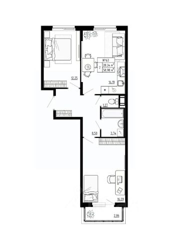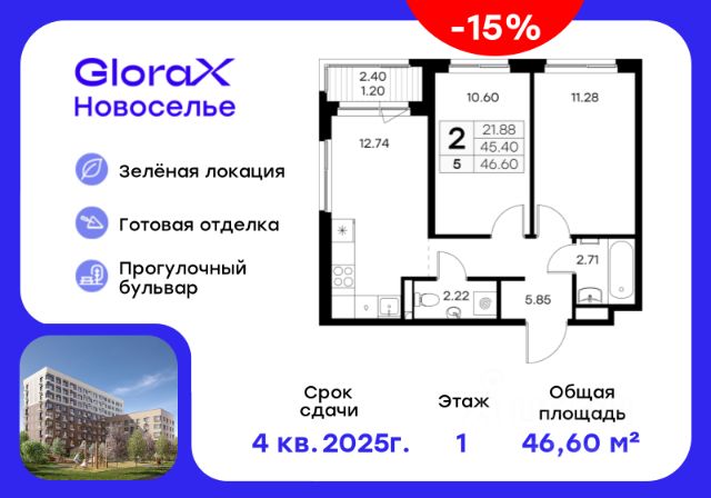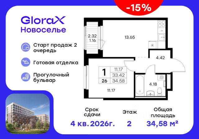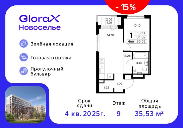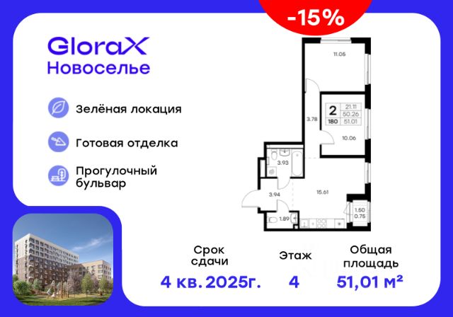 Продается 2-комн. квартира на 4-м этаже в строящемся проекте комфорт-класса GloraX Новоселье. Общая площадь лота составляет 51,01 кв. м, из которых 21,11 кв. м отведено под жилую и 15,61 кв. м под кухонную зону. Номер квартиры - 180