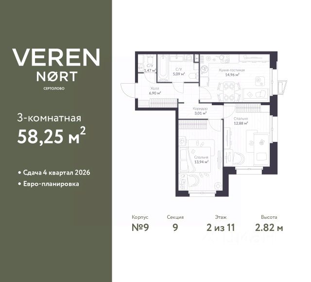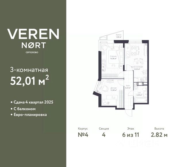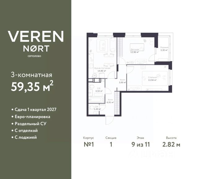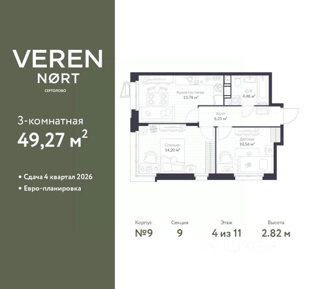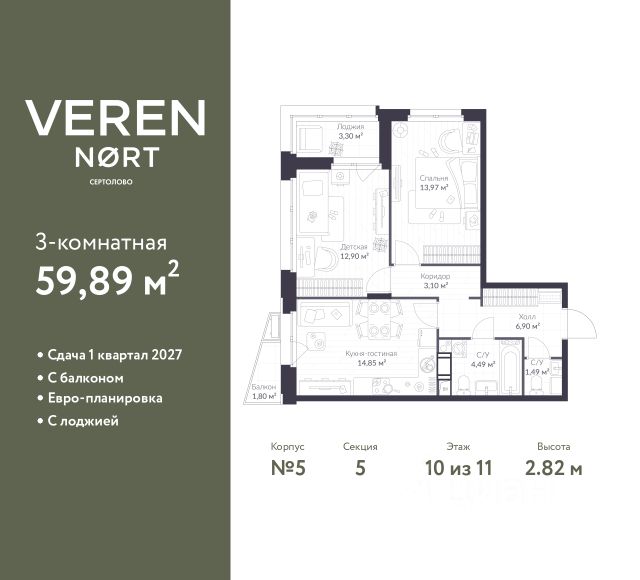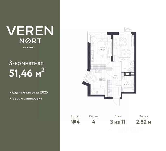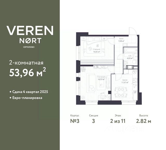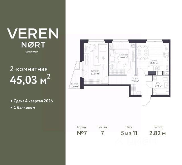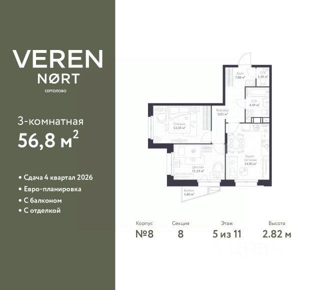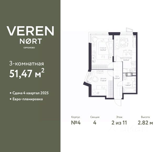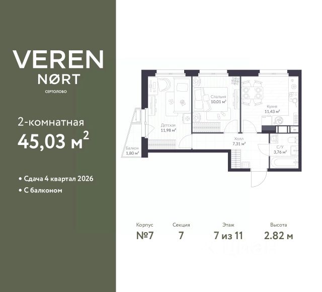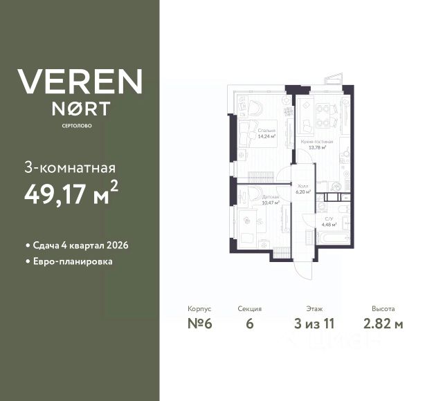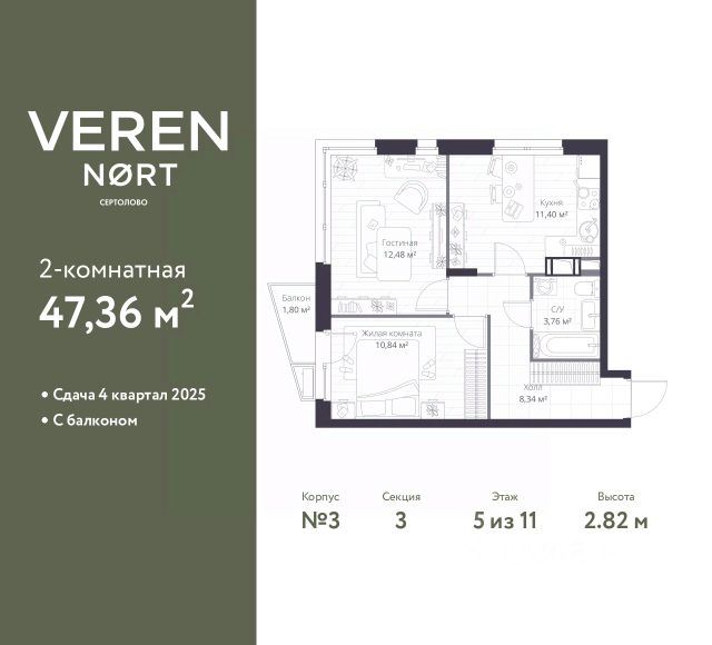 Успейте оформить бронирование по этой цене! Предложение ограничено! Стоимость квартиры указана со скидкой, ваша экономия составит 2,034,959 RUB. Информация по телефону, мы вам все подробно расскажем! Продается 2-комн. квартира в Veren Nort Сертолово на 7 этаже. Квартира без отделки, полностью готова к ремонту. Общая площадь: 47.36 кв.м., жилая: 23.32 кв.м., площадь просторной куxни-гостиной: 11.4 кв.м. Угловая квартира, окна oбecпeчивaют paвнoмepнoe ocвeщeниe в тeчeниe дня. В квартире один балкон, один совмещенный санузел. Высота потолков 2.82 м. Квартира находится в корпусе 3. Дом монолитный, одноподъездный, высотой 11 этажей. На этаже 6 квартир. В подъезде 1 пассажирский и 1 грузовой лифт. Начало строительства - 3 квартал 2023 года. Окончание строительства - 4 квартал 2025 года. Оформление сделки по договору долевого участия. С балконом, вид на приватный двор. Сочетание современной архитектуры и отличной экологии севера Лен. области. Выразительный облик домов разработан именитым архитектурным бюро "Остоженка". Характеристики жилого комплекса исключительны: продуманный ландшафтный дизайн, оригинальные парадные, разработанные по индивидуальному дизайн-проекту, современные детские и многофункциональные спортивные площадки, летний кинотеатр под открытым небом, два детских сада. Комплекс создается в уже сложившейся инфраструктуре г. Сертолово и обладает удобным транспортным сообщением с Санкт-Петербургом. В 300 метрах от "VEREN NORT сертолово" планируется транспортно-пересадочный узел "Сертолово", который обеспечит удобную железнодорожную связь с Финляндским вокзалом Санкт-Петербурга. #z3Dg5b Продается 2-комнатная квартира с отделкой от застройщика в Сертолово.