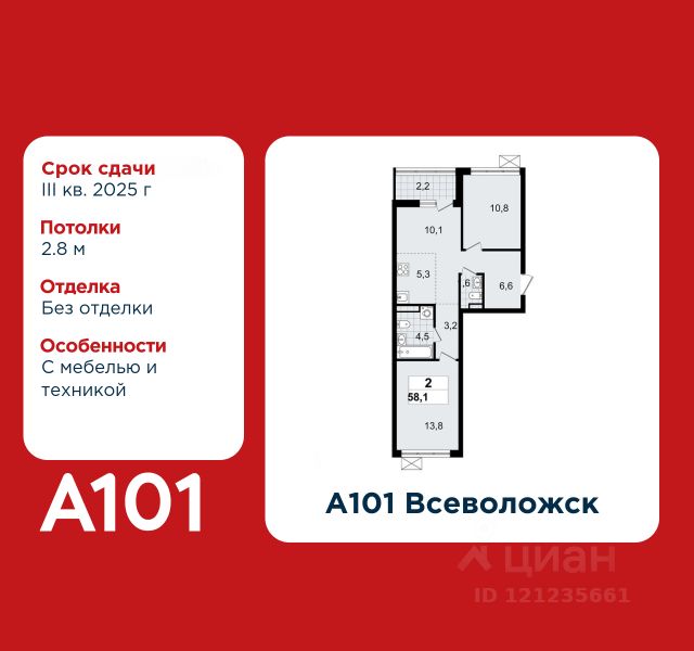 2-комнатная квартира площадью 39.60 в ЖК "А101 Всеволожск" c лоджией на 5 этаже. Квартира white box. Вид из окна во двор. В квартире 1 санузел. Высота потолков 2.8 м. Ключи в 2025 году. Предложения от застройщика на октябрь 2025: - Гибкая рассрочка 20 000 руб/мес. и первым взносом 10%. ОТДЕЛКА Квартира с предчистовой отделкой предполагает: качественную стяжку на полах под финишное покрытие, потолок с обеспыливающей грунтовкой белого цвета, ровные стены с покрытием штукатурка. Выполнены все работы по проведению электрики. На все отделочные работы от застройщика предоставляется гарантия. Если вы хотите дозаказать дизайнерскую отделку, обращайтесь к нашими специалистами. ОСОБЕННОСТИ ПЛАНИРОВКИ ПАРАДНАЯ В каждой парадной предусмотрены места для хранения велосипедов и колясок, гостевой санузел, лапамойка (место для мытья домашних животных или колес велосипедов) и удобная зона ожидания для гостей. ДВОРЫ И ОКРУЖЕНИЕ Просторные дворы свободны от машин и закрыты от посторонних. Большую часть комплекса займут благоустроенные зелёные зоны, теневые сады и городские общественные пространства с развитой тротуарной сетью и велодорожками. Каждый дом оборудован системами видеонаблюдения и контроля доступа. Не хватает средств на покупку кладового помещения? Оформите ипотеку на квартиру и добавьте к ней часть стоимости кладовой. ЗАСТРОЙЩИК ГК "А101" - крупный инвестиционно-строительный холдинг, занимает 6-е место по объему строительства в России (по данным "Единого ресурса застройщиков" на 2023 год). НКР присвоило ГК "А101" кредитный рейтинг A+.ru, подтверждая его надежность и финансовую устойчивость для завершения строительства ЖК. Продам 2-комнатную квартиру в новостройке с отделкой в Всеволожске.