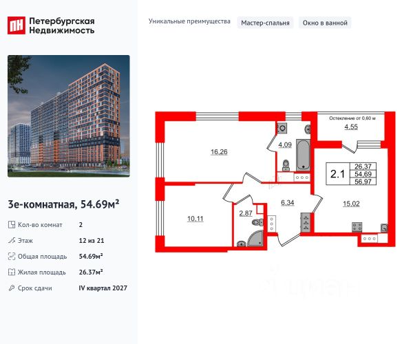 Продается уютная 2-комнатная квартира от застройщика в жилом комплексе "Город звезд" в новом городе на правом берегу Невы. До метро можно добраться на транспорте всего за 13 минут. Мастер-спальня с собственной ванной комнатой. Самое приватное пространство в вашей квартире. Уникальная, функциональная европланировка, большая кухня-гостиная 17.18 м², вместительная прихожая 5.47 м². Общая площадь квартиры - 52.62 м², жилая 23.83 м², высота потолка 2.77 м. Квартира продается с отделкой "NORD LINE SILVER". Что особенного в ЖК "Город звезд"? • Инновационный Лицей Setl с оригинальной архитектурной концепцией и уникальной образовательной средой • Невский лесопарк под окнами - всегда свежий воздух и полноценный отдых на природе • Четыре тематические площади отдыха с разнообразным благоустройством • Аллея Звёзд - променад протяженностью 5 км с ландшафтным озеленением, зонами отдыха и велодорожкой • Выход на набережную реки Утки, где можно порыбачить или взять напрокат лодку • Единая входная группа с ресепшен и подземный паркинг