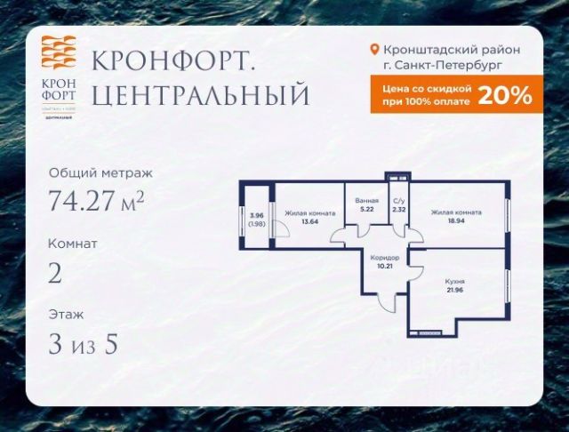 Стоимость квартиры указана со скидкой 20%. Скидка предоставляется при 100% оплате или несубсидированной ипотеке. Предлагается квартира площадью 60.75 кв.м в жилом комплексе "Кронфорт. Центральный" в Санкт-Петербурге (Кронштадт). Возможна покупка с использованием льготных и специальных ипотечных программ с государственной поддержкой. Высота потолков в квартирах — от 3 до 3,4 метров, окна увеличенного размера, есть варианты с эркерами, французскими балконами, лоджиями и террасами. Жилой квартал состоит из пяти четырехэтажных корпусов с закрытыми охраняемыми дворами, свободными от машин. Первые этажи формируют торговые променады в стиле пешеходных улиц исторической части Петербурга и Кронштадта. Внутренние пространства между корпусами — пешеходные зоны с уютными площадями. Архитектурный облик квартала разработан бюро "Проектная культура" и международной компанией Chapman Taylor. Инфраструктура комплекса включает: - Лицей с двумя бассейнами - Детский сад на 150 мест с бассейном и закрытой территорией - Веревочный парк - Игровые площадки для активного отдыха; - Кабинет врача общей практики. - Подземные паркинги с лифтами. - Мусоросборные камеры, индивидуальные кладовые. - Закрытые дворы с контролем доступа и видеонаблюдением. - Мультформатный стрит-ретейл с кафе и ресторанами. - Триатлон-центр и беговые/велодорожки. - Учебно-тренировочный комплекс для детей "Лагерь настоящих героев". Транспортная доступность обеспечивает удобный выезд на КАД (около 1-3 км), 2 минуты пешком до автобусной остановки "Лицей", 25 минут до Сестрорецка, 30 минут до "Лахта-центра", 50 минут до аэропорта "Пулково" и 60 минут до Московского вокзала. Для любителей моря доступен маршрут на "Метеоре" до центра Санкт-Петербурга. Отделка квартир предлагается как с готовой чистовой отделкой, так и со свободной планировкой без отделки для реализации индивидуальных дизайнерских решений. В третьем корпусе, продажи которого стартовали в марте 2025 года, доступны квартиры с просторными террасами, тремя балконами, кухнями-гостиными до 38 кв.м с окнами на две стороны, обеспечивающими панорамное освещение и виды. Если вам нужна помощь с оформлением ипотеки или дополнительная информация по комплексу и условиям покупки, обращайтесь в отдел продаж за консультацией.