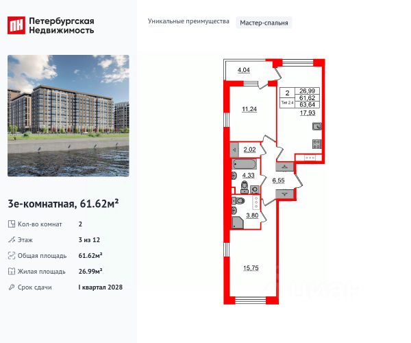 Продаётся 2-комнатная квартира в ЖК "Большая Охта" на 3 этаже. Общая площадь составляет 55.50 кв. м. Квартира с white box отделкой. Жилой комплекс "Большая Охта" располагается по адресу Санкт-Петербург, Красногвардейский. "ЛСР. Большая Охта" - проект бизнес-класса, в Красногвардейском районе между Якорной и Партизанской улицами, рядом с центром Петербурга. Престижный комплекс с удобной пешеходной и транспортной доступностью. Особенности квартиры высокие потолки и увеличенные окна. Горизонтальная разводка труб водоснабжения и отопления и вынесенные в холлы счетчики сохранят эстетичный дизайн комнат. Встроенные клапаны инфильтрации воздуха будут поддерживать чистоту и свежесть воздуха. Расположение: • 8 мин на авто до станции метро "Новочеркасская"; • 10 мин на авто до станции метро "Ладожская"; • 10 мин на авто до Таврического сада и исторического центра города; • 13 мин на авто до станции метро "Чернышевская"; • 25 мин на авто до КАД. Пространство внутри комплекса разделено на функциональные зоны: тематические, спортивные, уединенные. Все площадки окружают взрослые хвойные и лиственные деревья, подобранные с учетом роста, эстетики и сезонного цветения. Расширенная инфраструктура комплекса продумана до мелочей. Внутри квартала есть все необходимое для жизни с комфортом и удовольствием - детские сады и школы, магазины, площадки для спорта и отдыха, фитнес-залы, модные кофейни и общественные летние веранды. Преимущества: • Подземный паркинг и кладовые помещения; • Двор без машин; • Система "Умный дом" (в т.ч. управление домофоном со смартфона); • Пост охраны и консьерж; • Индивидуальный тепловой пункт; • Колясочные в каждой парадной; • Зарядка для электромобилей. Успейте приобрести квартиру на выгодных условиях! Чтобы узнать подробности, обращайтесь за консультацией по телефону. Продам 2-комнатную квартиру в новостройке с отделкой рядом с метро Новочеркасская.