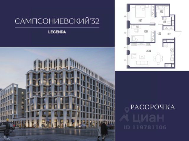 Квартира с двумя спальнями в комплексе "Сампсониевский 32" от LEGENDA на 2 этаже. -Общая площадь: 59.2 кв.м. -Жилая: 22.3 кв.м. -Площадь просторной кухни-столовой: 21.26 кв.м. -Высота потолков 2.7 м. Квартира - распашонка, без проходных комнат, окна выходят на paзные стороны дома. В квартире один раздельный санузел. ЖК "Сампсониевский, 32" квартал бизнес-класса в Выборгском районе Санкт-Петербурга недалеко от набережной Большой Невки и Петроградской стороны. Отличают комплекс каскадные фасады с большой площадью остекления, видовые квартиры с террасами. Современные инженерные и технические решения, повышающие качество жизни TechnoBox включают в себя: стационарный и удаленный контроль дома, систему Air Design, обеспечивающую чистый воздух без лишнего шума, мультисервисную сеть, объединяющую коммуникационные системы. Квартиры сдаются с предчистовой отделкой: выровнены пол и стены, проведена электрика, предусмотрена шумоизоляция, встроенная система вентиляции. В каждой квартире установлена взломостойкая входная дверь, окна со специальным термоизолированным алюминиевым профилем. В ЖК "Сампсониевский, 32" много вариантов планировок: квартиры с террасой, мастер-спальней, ванной комнатой с окном, гардеробной комнатой. Двор закрыт от транспорта, здесь будут зоны с дизайнерским оформлением для игр и отдыха. Срок сдачи 4 квартал 2026 года. В отапливаемом подземном паркинге 298 мест, спуститься туда можно на лифте из своей квартиры. Комплекс находится на границе крупных районов, рядом с набережными, которые ведут в Приморский, Калининский и Центральный районы, а через Сампсониевский, Гренадёрский и Кантемировский мосты можно попасть в Петроградский район. До станции метро "Выборгская" 900 м, до станции метро "Петроградская" 2,6 км. Финляндский вокзал находится в 2,5 км от ЖК, а Западный скоростной диаметр (ЗСД) в 10 км. Рядом с ЖК находится несколько гимназий, общеобразовательных школ и детских садов. Здесь много медицинских учреждений, кафе, ресторанов, торговых центров, гипермаркетов. Меньше чем в 1 км от ЖК Сампсониевский и Выборгский сады, а в 2 км находится Ботанический сад, набережная реки Карповки с качелями и зонами отдыха у воды. Продам 2-комнатную квартиру в новостройке с отделкой рядом с метро Петроградская.