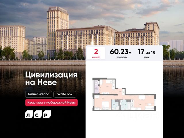 Цена действует при 100% оплате и на определенные ипотечные программы. Подробности — в отделе продаж по телефону. Продаётся 2-комнатная квартира в ЖК "Цивилизация на Неве" на 6 этаже. Общая площадь составляет 60.51 кв. м. Квартира с white box отделкой. Жилой комплекс "Цивилизация на Неве" располагается по адресу Санкт-Петербург, Невский. "Цивилизация на Неве" - видовые дома бизнес-класса, расположенные вдоль набережной Невы, всего в 7 км от исторического центра. Жилой комплекс идеально выражает особый дух, свойственный знаменитым просторным кварталам постройки сталинской эпохи в Москве и на Московском проспекте в Петербурге. Расположение: • 15 мин на авто до Невского проспекта; • 15 мин на авто до Московского вокзала; • 5 мин на авто до станции метро "Улица Дыбенко"; • 14 мин (7 км) до КАД. Уникальный дизайн входных зон, закрытая территория, видеонаблюдение и охрана, подземный паркинг с лифтом и другие особенности проекта отвечают заявленному классу. В каждом дворе предусмотрено озеленение по индивидуальному ландшафтному проекту с благородными растениями и кустарниками. Преимущества: • Закрытая территория с видеонаблюдением; • Подземный паркинг с лифтом; • Детская площадка на приватной безопасной территории; • Несколько детских садов и школ; • Инфраструктура шаговой доступности на первых этажах корпусов. Успейте приобрести квартиру на выгодных условиях! Чтобы узнать подробности, обращайтесь за консультацией по телефону.