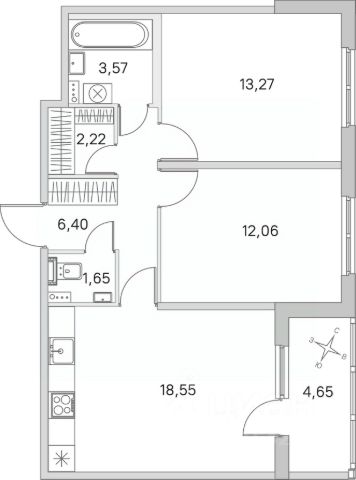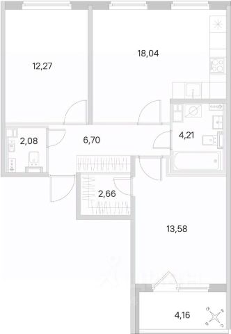 Просторная кухня-гостиная (17,13) и две изолированные комнаты (14,18 и 12,43)— идеальное решение для семьи. Два совмещенных санузла (с ванной и душевой) для вашего удобства, лоджия (3,67) с французским остеклением (от потолка до пола).