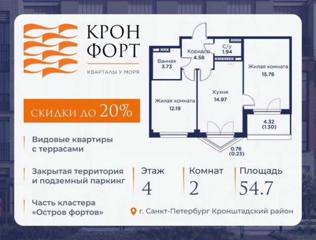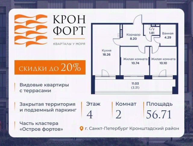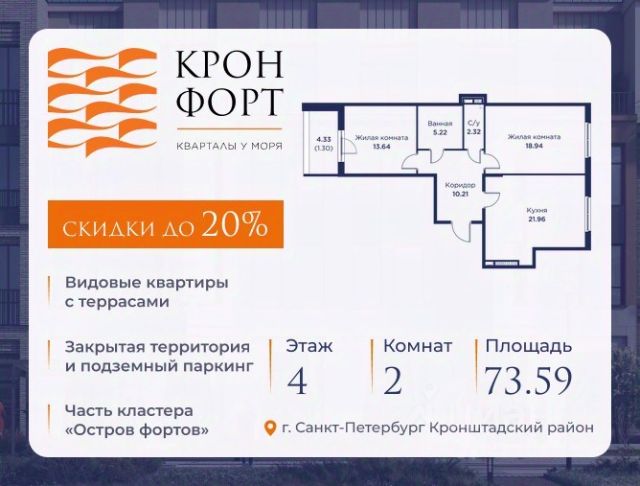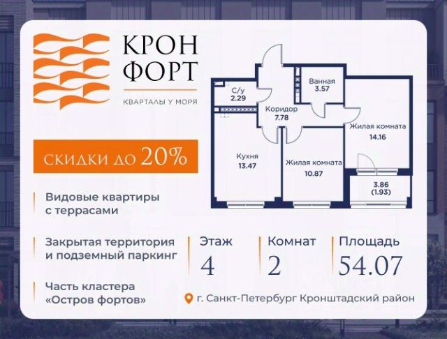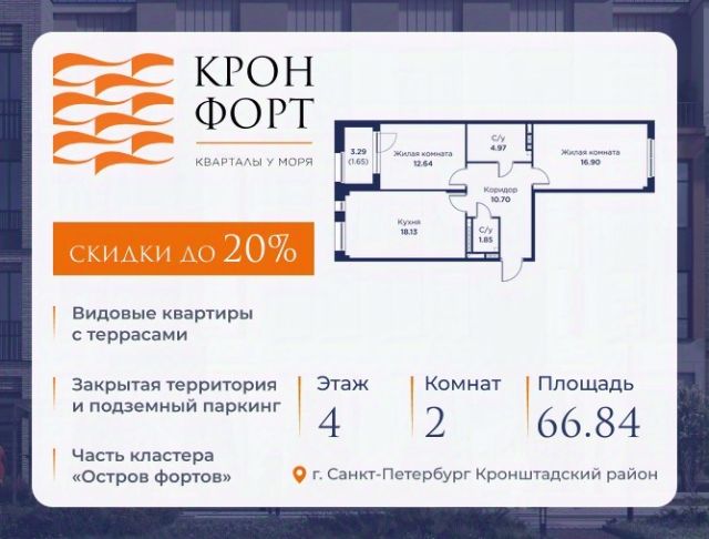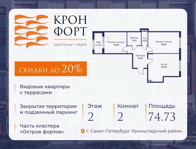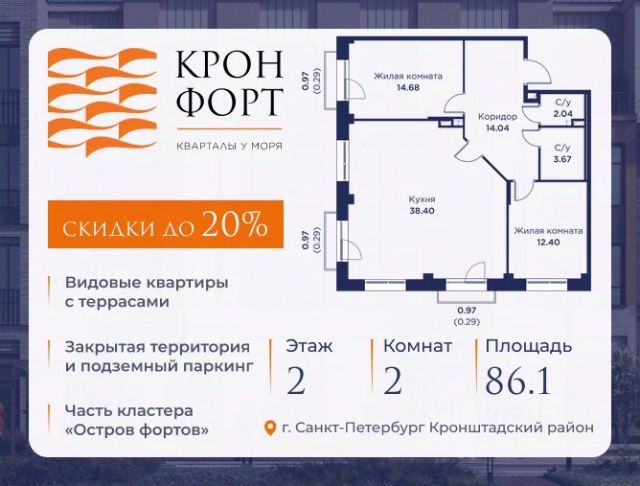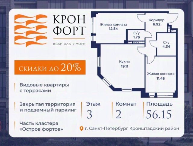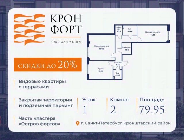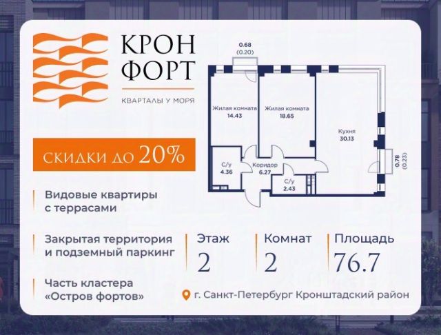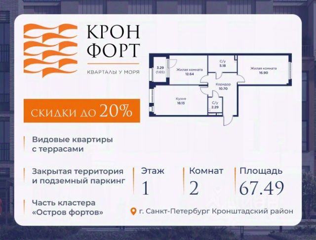 Стоимость квартиры указана со скидкой 20%. Скидка предоставляется при 100% оплате или несубсидированной ипотеке. Предлагается квартира площадью 60.75 кв.м в жилом комплексе "Кронфорт. Центральный" в Санкт-Петербурге (Кронштадт). Возможна покупка с использованием льготных и специальных ипотечных программ с государственной поддержкой. Высота потолков в квартирах — от 3 до 3,4 метров, окна увеличенного размера, есть варианты с эркерами, французскими балконами, лоджиями и террасами. Жилой квартал состоит из пяти четырехэтажных корпусов с закрытыми охраняемыми дворами, свободными от машин. Первые этажи формируют торговые променады в стиле пешеходных улиц исторической части Петербурга и Кронштадта. Внутренние пространства между корпусами — пешеходные зоны с уютными площадями. Архитектурный облик квартала разработан бюро "Проектная культура" и международной компанией Chapman Taylor. Инфраструктура комплекса включает: - Лицей с двумя бассейнами - Детский сад на 150 мест с бассейном и закрытой территорией - Веревочный парк - Игровые площадки для активного отдыха; - Кабинет врача общей практики. - Подземные паркинги с лифтами. - Мусоросборные камеры, индивидуальные кладовые. - Закрытые дворы с контролем доступа и видеонаблюдением. - Мультформатный стрит-ретейл с кафе и ресторанами. - Триатлон-центр и беговые/велодорожки. - Учебно-тренировочный комплекс для детей "Лагерь настоящих героев". Транспортная доступность обеспечивает удобный выезд на КАД (около 1-3 км), 2 минуты пешком до автобусной остановки "Лицей", 25 минут до Сестрорецка, 30 минут до "Лахта-центра", 50 минут до аэропорта "Пулково" и 60 минут до Московского вокзала. Для любителей моря доступен маршрут на "Метеоре" до центра Санкт-Петербурга. Отделка квартир предлагается как с готовой чистовой отделкой, так и со свободной планировкой без отделки для реализации индивидуальных дизайнерских решений. В третьем корпусе, продажи которого стартовали в марте 2025 года, доступны квартиры с просторными террасами, тремя балконами, кухнями-гостиными до 38 кв.м с окнами на две стороны, обеспечивающими панорамное освещение и виды. Если вам нужна помощь с оформлением ипотеки или дополнительная информация по комплексу и условиям покупки, обращайтесь в отдел продаж за консультацией. Продается 2-комнатная квартира в новостройке в микрорайоне Кронштадт в Санкт-Петербурге.