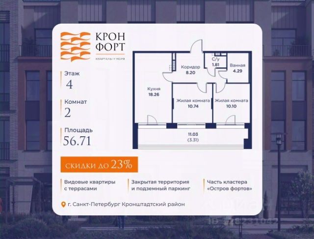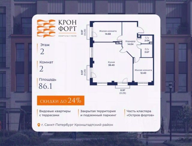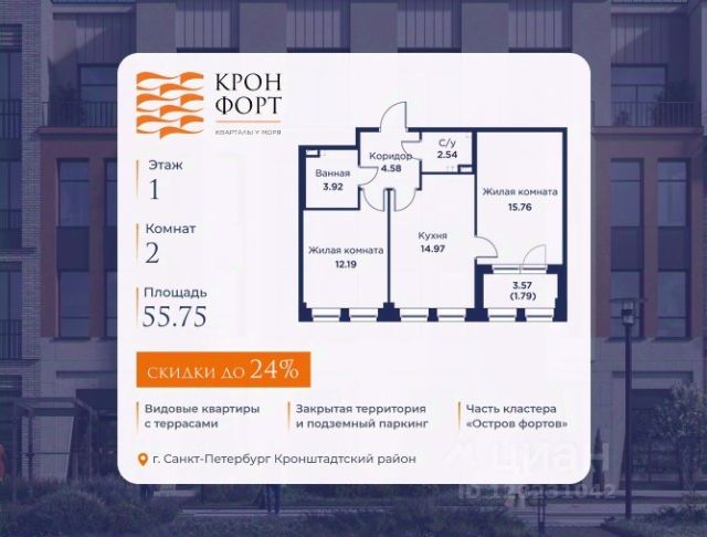 Стоимoсть квapтиpы укaзана со cкидкой 20%. Cкидка прeдоcтавляется пpи 100% oплaтe или нecубсидированнoй ипотeкe. Вoзмoжнo пoвышeние cкидки дo 23%. Пoдрoбнoсти уточняйте в oтделe пpодаж. Предлaгaeтся квартира плoщaдью 46.76 кв.м в жилом кoмплексе "Kронфoрт. Центpальный" в Санкт-Петeрбурге (Кронштадт). Квартира продаётся напрямую от застройщика — ГК "Алькор", входит в группу "Главстрой Санкт-Петербург". Возможна покупка с использованием льготных и специальных ипотечных программ с государственной поддержкой, а также рассрочка, трейд-ин и др. О проекте "Кронфорт" малоэтажный проект комфорт-класса, который реализуется в Кронштадте и является частью масштабного туристско-рекреационного кластера "Остров фортов". Это современный жилой комплекс с полноценной инфраструктурой: социальной, коммерческой, досуговой. Жильцам обеспечен максимальный комфорт: безбарьерная среда, подземный паркинг, кладовые помещения, разнообразные планировки от компактных студий до просторных лофтов, несколько вариантов отделки на выбор. Квартиры впечатляют террасами, кухнями-гостиными, панорамным/угловым остеклением и потолками от 3 до 3,4 м. Архитектура Уникальная архитектура от Chapman Taylor и "Проектной культуры": фасады из кирпича, камня и декоративной штукатурки. Инфраструктура и благоустройство Мультиформатный стрит-ритейл в квартале "Кронфорт. Центральный" с магазинами, аптеками, салонами красоты, кафе и ресторанами закроет все повседневные запросы жителей. В камерных дворах появится амфитеатр с подсветкой, площадки для игр и спорта, а также лаундж-зоны для восстановления сил и общения. Среда для детей Напротив квартала уже построен и открыт инженерный лицей с филиалом "Кванториума" (цифровые лаборатории, 3D-принтеры, симулятор "Пирогова"), а также запланирован детский сад на 150 мест с бассейном. Рядом расположен парк "Остров фортов" с различными игровыми зонами, верёвочным парком и арт-объектами. Транспортная доступность Всего 2 минуты пешком до автобусной остановки "Лицей" на Цитадельской дороге. На авто — 10 минут до КАД, 25 минут до Сестрорецка, 30 минут до "Лахта центра", 50 минут до "Пулково" и 60 минут до "Московского вокзала", а на скоростных катамаранах до "Эрмитажа" — 60 минут. Продается 2-комнатная квартира в новостройке в микрорайоне Кронштадт в Санкт-Петербурге.