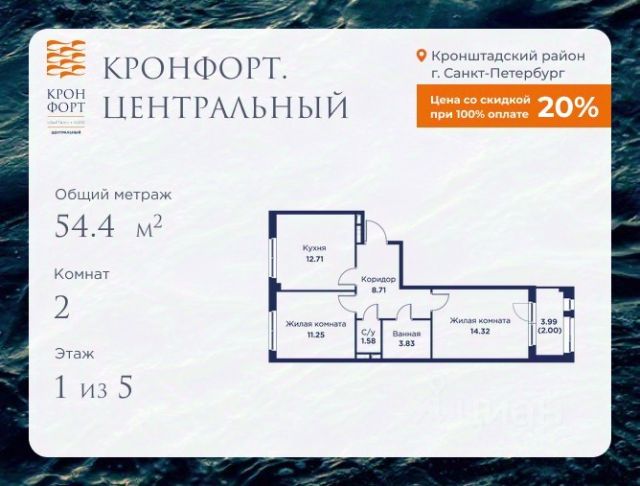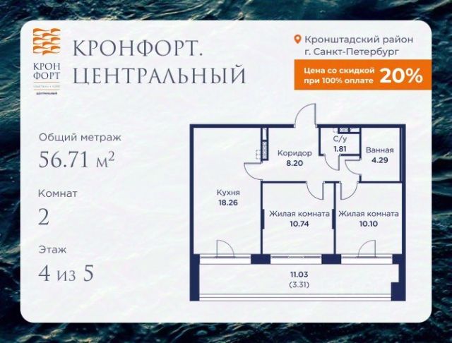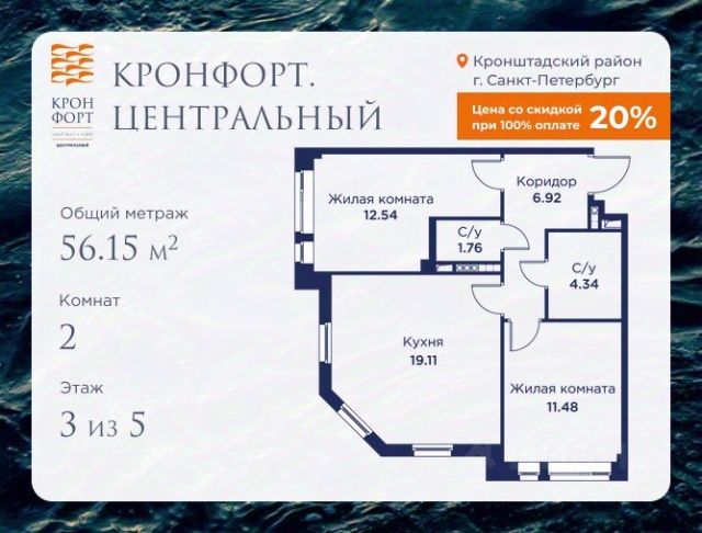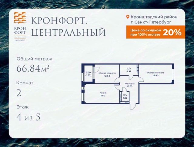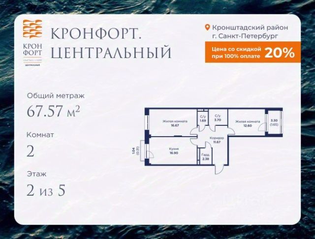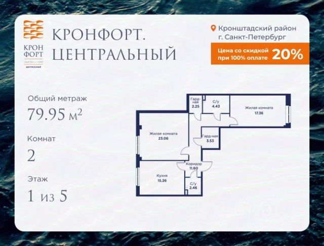 Стоимость квартиры указана со скидкой 20%. Скидка предоставляется при 100% оплате или несубсидированной ипотеке. Предлагается квартира площадью 46.76 кв.м в жилом комплексе "Кронфорт. Центральный" в Санкт-Петербурге (Кронштадт). Возможна покупка с использованием льготных и специальных ипотечных программ с государственной поддержкой. Высота потолков в квартирах — от 3 до 3,4 метров, окна увеличенного размера, есть варианты с эркерами, французскими балконами, лоджиями и террасами. Жилой квартал состоит из пяти четырехэтажных корпусов с закрытыми охраняемыми дворами, свободными от машин. Первые этажи формируют торговые променады в стиле пешеходных улиц исторической части Петербурга и Кронштадта. Внутренние пространства между корпусами — пешеходные зоны с уютными площадями. Архитектурный облик квартала разработан бюро "Проектная культура" и международной компанией Chapman Taylor. Инфраструктура комплекса включает: - Лицей с двумя бассейнами - Детский сад на 150 мест с бассейном и закрытой территорией - Веревочный парк - Игровые площадки для активного отдыха; - Кабинет врача общей практики. - Подземные паркинги с лифтами. - Мусоросборные камеры, индивидуальные кладовые. - Закрытые дворы с контролем доступа и видеонаблюдением. - Мультформатный стрит-ретейл с кафе и ресторанами. - Триатлон-центр и беговые/велодорожки. - Учебно-тренировочный комплекс для детей "Лагерь настоящих героев". Транспортная доступность обеспечивает удобный выезд на КАД (около 1-3 км), 2 минуты пешком до автобусной остановки "Лицей", 25 минут до Сестрорецка, 30 минут до "Лахта-центра", 50 минут до аэропорта "Пулково" и 60 минут до Московского вокзала. Для любителей моря доступен маршрут на "Метеоре" до центра Санкт-Петербурга. Отделка квартир предлагается как с готовой чистовой отделкой, так и со свободной планировкой без отделки для реализации индивидуальных дизайнерских решений. В третьем корпусе, продажи которого стартовали в марте 2025 года, доступны квартиры с просторными террасами, тремя балконами, кухнями-гостиными до 38 кв.м с окнами на две стороны, обеспечивающими панорамное освещение и виды. Если вам нужна помощь с оформлением ипотеки или дополнительная информация по комплексу и условиям покупки, обращайтесь в отдел продаж за консультацией. 2-комнатная квартира в новостройке в Кронштадте.