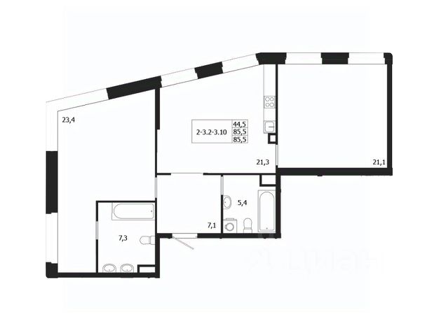 Жилая площадь 57.49 м2, кухня 10.78 м2, черновая отделка.