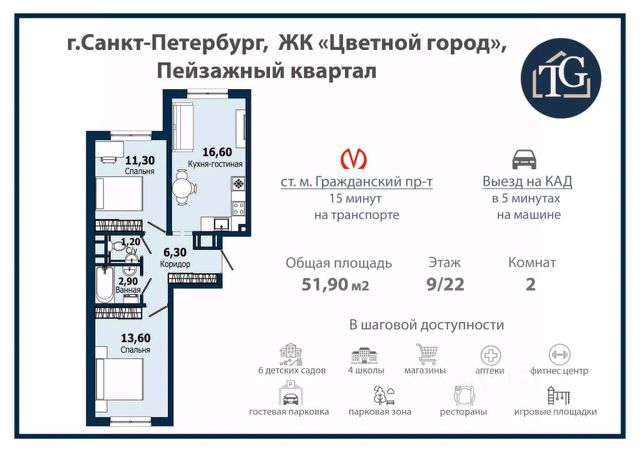 В шаговой доступности от дома расположена станция метро (расстояние по прямой) "Девяткино" (1.9 км).