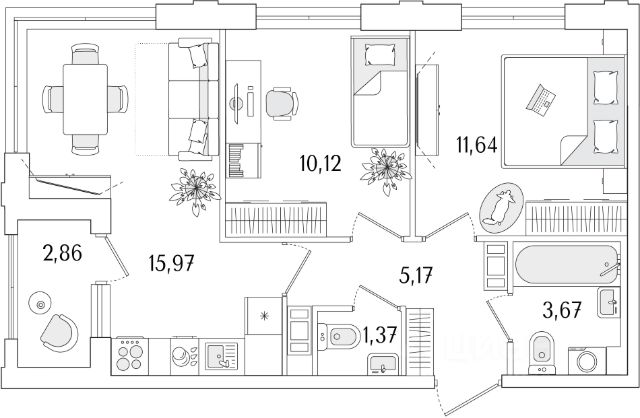 В квартире сделан ремонт - можно въехать и жить, все есть, включая кухню и спальные места.
