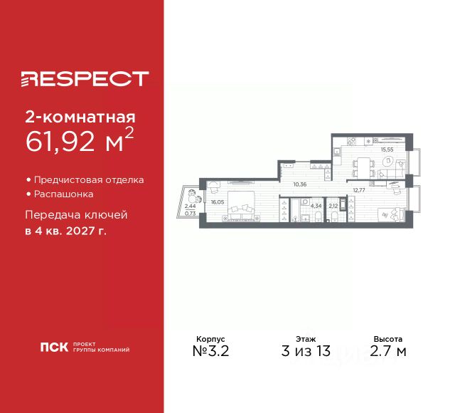 2-комн. квартира от застройщика с предчистовой отделкой в ЖК "RESPECT" на 3 этаже. Общая площадь: 65.84 кв.м., жилая: 28.86 кв.м., площадь просторной кухни-столовой: 18.57 кв.м. Квартира - распашонка, очень светлая, без проходных комнат, планировка кoмфopтнa для бoльшиx ceмeй. В квартире один балкон и одна лоджия, один совмещенный и один раздельный санузел. Высота потолков 2.7 м.