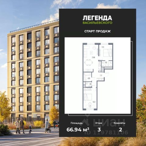 Продается двухкомнатная квартира с предчистовой отделкой в ЖК "ЛЕГЕНДА Васильевского" на 3 этаже. Общая площадь: 66.94 кв.м., жилая: 26.53 кв.м., площадь просторной кухни-столовой: 23.86 кв.м. Квартира - распашонка, без проходных комнат, окна выходят на paзные стороны дома. В квартире один раздельный санузел. Высота потолков 2.72 м. "ЛЕГЕНДА Васильевского" жилой квартал в минутной доступности от Финского залива, главного креативного хаба Санкт-Петербурга Севкабель Порта и других точек притяжения. Современные инженерные и технические решения, повышающие качество жизни TechnoBox включают в себя: стационарный и удаленный контроль дома, систему вентиляции Air Design - здоровое дыхание без лишнего шума, мультисервисную сеть, объединяющую коммуникационные системы, удаленное управление электроприборами, контроль отопления в каждом помещении, поддерживающий оптимальный температурный баланс во время "холодного" периода", датчики протечки, датчик открытия входной двери. Мультисервисная сеть (МСС) объединяет ключевые слаботочные системы дома, задавая им единый высокий стандарт работы, обеспечивая надёжность их функционирования и управления. Квартира готова к декорированию. Застройщиком сделана шумоизоляция; стены подготовлены для отделки; проведена электрика с учетом рекомендаций по расстановке мебели и бытовой техники; выровнен пол. В каждой квартире установлена взломостойкая входная дверь, окна со специальным термоизолированным алюминиевым профилем. Двор жилого комплекса "ЛЕГЕНДА Васильевского" закрыт. Проект состоит из шести разноформатных корпусов с ритмичными фасадами в духе пост-конструктивизма. Геометрия жилого комплекса состоит из четко простроенных осей, чередующих открытые пространства и объемы корпусов, каждый из которых обладает своим визуальным кодом индивидуальным рисунком фасада и цветовой палитрой. Корпуса образуют периметр с общественными пространствами: площадью с кафе, магазинами и пешеходным променадом с детскими игровыми хабами, местами для спокойного отдыха и workout-зоной. На территории комплекса предусмотрены теплый подземный паркинг и два наземных 4-х этажных паркинга. Продается 2-комнатная квартира в новостройке рядом с метро Приморская.