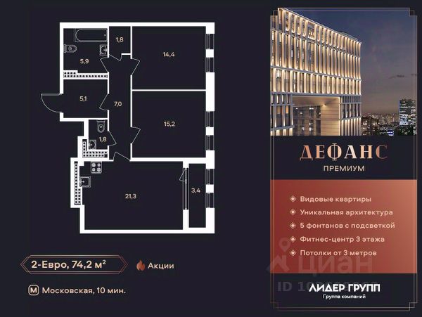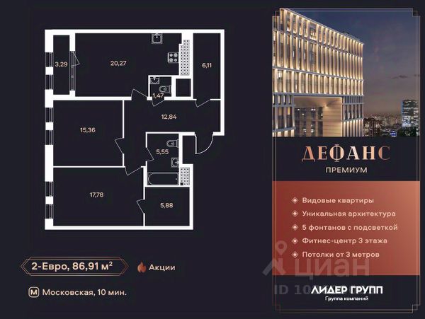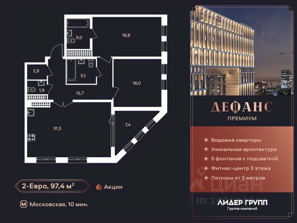 ЖК "Дефанс Премиум". Строительство завершено. Дом получил заключение о соответствии и готовится к вводу! Это проект авторской архитектуры с уникальными форматами квартир в 10 минутах ходьбы от станции метро "Московская". Дом выполнен в виде двух 23-х этажных арок, основания которых объединены единым внутренним пространством с большой парадной лестницей, променадом и большим фонтанным комплексом с подсветкой. В составе проекта построен большой фитнес-центр с бассейнами и зоной СПА. Часть квартир отделена от остальных жилых этажей специальным техническим этажом — это снимает все ограничения по перепланировке. Для части квартир предусмотрены индивидуальные входные группы и дополнительные лифты премиального немецкого бренда Tyssen Krupp (TKE). Фасады, облицованные испанской керамикой и алюминиевые панорамные окна с энергоэффективными стеклами AGС Energy подчеркивают высокий статус дома. На квартиры ЗПИФ и переуступки семейная ипотека не распространяется! Купить 2-комнатную квартиру в новостройке в округе Гагаринское в Санкт-Петербурге.