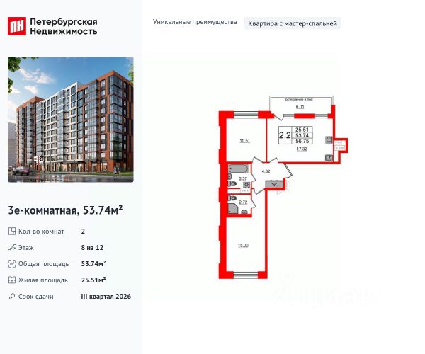 Продается уютная 2-комнатная квартира от застройщика в жилом комплексе "Титул в Московском" в престижном Московском районе. До метро можно добраться пешком всего за 25 минут. Мастер-спальня с собственной ванной комнатой. Самое приватное пространство в вашей квартире. Уникальная, функциональная европланировка, большая кухня-гостиная 17.32 м², вместительная прихожая 4.82 м². Общая площадь квартиры - 53.74 м², жилая 25.51 м², высота потолка 2.77 м. Квартира продается с отделкой "NORD LINE WHITE ВК NEW". Что особенного в ЖК "Титул в Московском"? • Престижный Московский район • Авторская архитектурная концепция • 2 центральные входные группы с ресепшн и лаундж-зонами • Кленовая аллея с арт-стеллой, цветочная аллея и сад трав • Уютные дворы-патио, площадки SetlKids и SetlSport • Инновационный Лицей Setl с оригинальной архитектурной концепцией и уникальной образовательной средой Купить 2-комнатную квартиру в новостройке в округе Новоизмайловское в Санкт-Петербурге.
