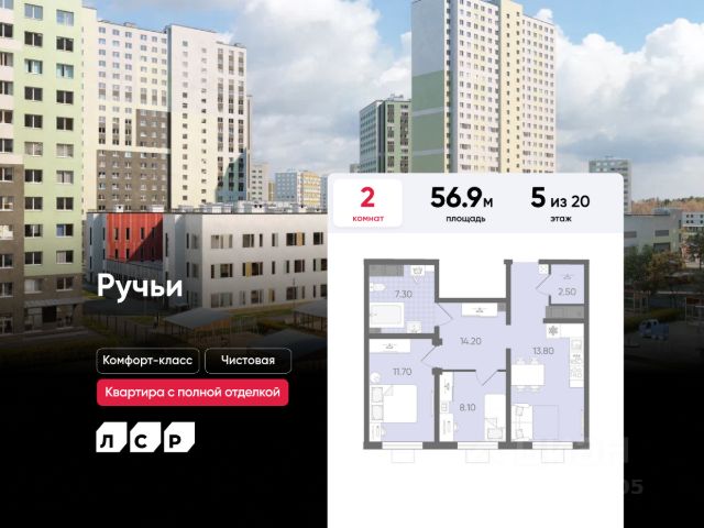 Продается 2-комнатная квартира в ЖК "Пейзажный квартал" на 20 этаже. Общая площадь составляет 54.80 кв. м. Квартира с чистовой отделкой. Жилой комплекс "Пейзажный квартал" располагается по адресу Санкт-Петербург, Красногвардейский Вдоль леса и рядом с рекой Охта. К 2026 году на берегах реки Охты будет создан Пейзажный парк с летними экотропами и зимними горками для тюбингов, скейт-парком и летним кинотеатром. Расположение: • 15 минут на авто до КАД; • 20 минут на авто до станций "Гражданский проспект" и "Академическая"; • 20 минут до ж/д станции "Ручьи"; Небольшой уютный квартал является частью масштабной застройки ЖК "Цветной город", и в то же время стоит обособленно от шумных массивов. Квартал граничит с новейшим объектом городской экосистемы - Пейзажным парком. Соседние кварталы уже застроены и заселены, поэтому здесь нет проблем с привычной городской инфраструктурой - работают детские сады и школы, открыты магазины и кафе, фитнес-клубы, студии красоты и пространства для творчества и отдыха. Преимущества: • Жизнь вблизи природы, но с городской пропиской; • Система "Умный дом" (в т.ч. управление домофоном со смартфона); • Сквозные парадные с колясочными помещениями; • Детский сад на 170 мест и школа на 300 учеников на территории ЖК; • Двор без машин. Успейте приобрести квартиру на выгодных условиях! Чтобы узнать подробности, обращайтесь за консультацией по телефону. Купить 2-комнатную квартиру в новостройке в округе Полюстрово в Санкт-Петербурге.