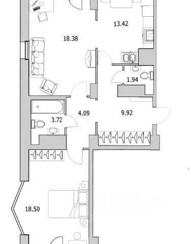- Уютная спальня 13,4 м²: Гарантирует комфорт и полноценный отдых.