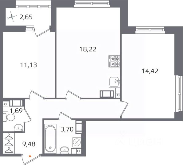 Санузел: раковина с тумбой, ванна или душевая кабина, унитаз, смесители. Выполнена полная разводка электропроводки.