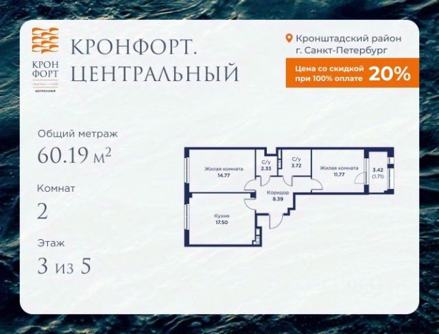 Стоимость квартиры указана со скидкой 20%. Скидка предоставляется при 100% оплате или несубсидированной ипотеке. Предлагается квартира площадью 66.06 кв.м в жилом комплексе "Кронфорт. Центральный" в Санкт-Петербурге (Кронштадт). Возможна покупка с использованием льготных и специальных ипотечных программ с государственной поддержкой. Высота потолков в квартирах — от 3 до 3,4 метров, окна увеличенного размера, есть варианты с эркерами, французскими балконами, лоджиями и террасами. Жилой квартал состоит из пяти четырехэтажных корпусов с закрытыми охраняемыми дворами, свободными от машин. Первые этажи формируют торговые променады в стиле пешеходных улиц исторической части Петербурга и Кронштадта. Внутренние пространства между корпусами — пешеходные зоны с уютными площадями. Архитектурный облик квартала разработан бюро "Проектная культура" и международной компанией Chapman Taylor. Инфраструктура комплекса включает: - Лицей с двумя бассейнами - Детский сад на 150 мест с бассейном и закрытой территорией - Веревочный парк - Игровые площадки для активного отдыха; - Кабинет врача общей практики. - Подземные паркинги с лифтами. - Мусоросборные камеры, индивидуальные кладовые. - Закрытые дворы с контролем доступа и видеонаблюдением. - Мультформатный стрит-ретейл с кафе и ресторанами. - Триатлон-центр и беговые/велодорожки. - Учебно-тренировочный комплекс для детей "Лагерь настоящих героев". Транспортная доступность обеспечивает удобный выезд на КАД (около 1-3 км), 2 минуты пешком до автобусной остановки "Лицей", 25 минут до Сестрорецка, 30 минут до "Лахта-центра", 50 минут до аэропорта "Пулково" и 60 минут до Московского вокзала. Для любителей моря доступен маршрут на "Метеоре" до центра Санкт-Петербурга. Отделка квартир предлагается как с готовой чистовой отделкой, так и со свободной планировкой без отделки для реализации индивидуальных дизайнерских решений. В третьем корпусе, продажи которого стартовали в марте 2025 года, доступны квартиры с просторными террасами, тремя балконами, кухнями-гостиными до 38 кв.м с окнами на две стороны, обеспечивающими панорамное освещение и виды. Если вам нужна помощь с оформлением ипотеки или дополнительная информация по комплексу и условиям покупки, обращайтесь в отдел продаж за консультацией. Продается 2-комнатная квартира от застройщика в Кронштадте.