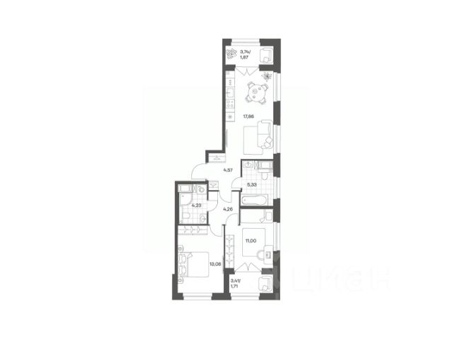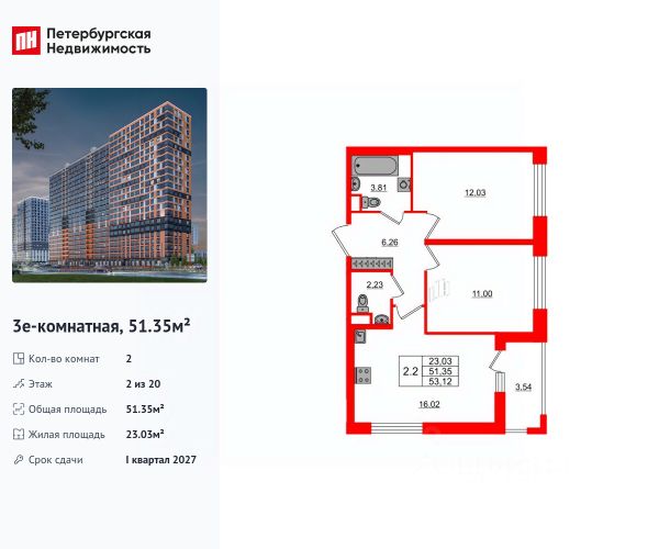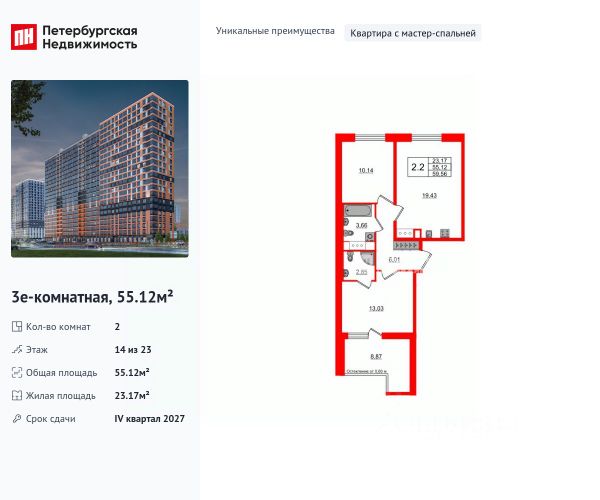 Продается квартира площадью 53.66 м² на 3 этаже 2 секции в Речной квартал от компании ГК "ТРЕСТ". Площадь кухни 15.66 м². Семейный жилой комплекс комфорт-класса "Речной квартал" от Группы компаний "ТРЕСТ" расположен в Невском районе Петербурга на пересечении Октябрьской набережной и Русановской улицы. Первая очередь квартала состоит из трёх корпусов, расположенных лучеобразно, чтобы максимально использовать естественное освещение и обеспечить видовые точки на локацию. Проект выделяется современными архитектурными решениями и дизайном. Концепция развития и благоустройства придомовой территории разделена на зоны отдыха, досуга и игровые площадки с учетом возраста и потребностей детей и взрослых. Квартал рассчитан на семейных покупателей, поэтому здесь нет студий: только одно-, двух- и трёхкомнатные квартиры. В проекте представлены квартиры с кухнями-гостиными, мастер-спальнями, гардеробными и кладовыми. "Речной квартал" - современный жилой комплекс с разнообразным благоустройством придомовой территории, просторными европланировками, закрытой охраняемой территорией и подземными паркингами. На территории комплекса уже функционирует детский сад на 110 мест. Также в квартале будет построена общеобразовательная школа на 475 мест с бассейном и стадионом. Открытие школы запланировано на 2029 год. Квартиры в ЖК "Речной квартал" можно приобрести с готовой отделкой от застройщика. Для покупателей квартир предусмотрено два варианта чистовой отделки "Ваниль" и "Шоколад". Чистовая отделка в квартирах ЖК "Речной квартал" предполагает монтаж натяжных потолков, укладку ламината, оклейку стен обоями под покраску, установку светильников и межкомнатных дверей. При отделке новой квартиры применяются качественные, натуральные и экологичные материалы, монтируется стильная импортная сантехника европейских брендов. В объявлении указана стоимость квартиры при 100% оплате. При других формах оплаты - базовую стоимость квартиры уточняейте на официальном сайте компании или у менеджера отдела продаж. Застройщик АО "Специализированный застройщик "Строительный трест".