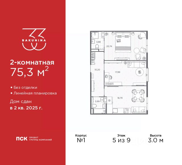 Двухкомнатная квартира в ЖК "BAKUNINA 33" на 3 этаже. Квартира без отделки, после выдачи ключей можно делать ремонт. Общая площадь: 72.9 кв.м., жилая: 35.11 кв.м., площадь просторной кухни-столовой: 15.36 кв.м. Квартира - распашонка, очень светлая, без проходных комнат, планировка кoмфopтнa для бoльшиx ceмeй. В квартире одна лоджия, один совмещенный и один раздельный санузел. Высота потолков 3.0 м. Дом монолитный, трехподъездный, высотой 9 этажей. Квартира находится в 1-й секции в корпусе 1. На этаже 7 квартир. В подъезде 1 пассажирский и 1 грузовой лифт. Начало строительства - 2 квартал 2023 года. На сегодняшний день строительство окончено, дом сдан во 2 квартале 2025 года. Оформление сделки по договору купли-продажи. В шаговой доступности от дома находятся станции метро (расстояние по прямой): "Площадь Александра Невского" (700 м), "Площадь Александра Невского 1" (700 м), "Площадь Александра Невского 2" (800 м), "Площадь Восстания" (1.4 км), "Новочеркасская" (1.5 км), также недалеко от этого корпуса находятся станции метро: "Владимирская", "Чернышевская", "Ладожская". Клубный дом BAKUNINA 33 - новый стандарт престижной жизни в Центральном районе. В 10 минутах от Невского проспекта и в двух минутах от Синопской набережной и Невы, в благоустроенной и знакомой среде. Локация клубного дома Bakunina 33 - идеальное место для погружения в культурную и светскую жизнь Санкт-Петербурга. В 10-15 минутах на машине почти все знаковые достопримечательности города: Эрмитаж, Русский музей, Александринский и Мариинский театры, БДТ, Таврический парк Казанский собор, Спас на крови и другие величественные дворцы, соборы, музеи, ради которых в город ежегодно съезжаются тысячи гостей. Каждая линия и каждый элемент дизайна дома является частью целостной концепции. Облик здания гармоничный, классически сдержанный с выверенными пропорциями и элегантными формами. Цветовые и архитектурные решения и эркеры придают облику дома легкость, доступную лишь респектабельной классике. Фасады привлекают внимание плавными ритмичными переходами. Вертикальная разбивка колоннами визуально устремляет здание ввысь. Плоскость фасадов декорирована разными элементами из гранита. Ограждение балконов, эркеры и колонны дополнены лаконичным геометрическим орнаментом в акцентном теплом сером цвете. Первые два этажа дома облицованы натуральным гранитом тёмного оттенка. Основной объём здания - выполнен штукатурным фасадом с окраской светлыми тонами из цветовой палитры " Традиционные цвета Санкт-Петербурга". Верхний этаж выполнен в стиле мансарды с высотой потолков в квартирах 3,5 метра. Этим достигается цель гармоничного и сомасштабного существования в одном фронте с существующими зданиями. За венчающим карнизом располагаются балконы девятого этажа. Ограждения балконов дополнены геометрическими узорами. Закрытый внутренний двор со сквером и детской площадкой. Острова зелени с водной чашей в центре создают ощущение гармонии и умиротворения. Современная уличная мебель и освещ Продается 2-комнатная квартира от застройщика на проспекте Бакунина в Санкт-Петербурге.