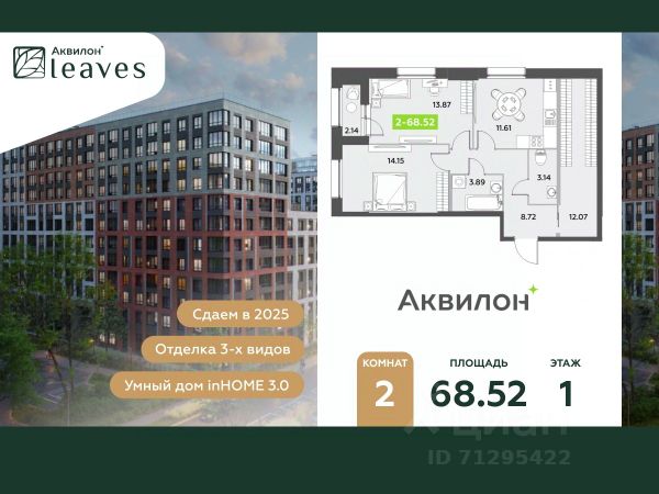 Купи квартиру в ЖК "Аквилон Leaves"! Отделка В квартире выполнена предчистовая отделка WhiteBox +Возможен дозаказ отделки в любом из 3 цветов: SAND, TERRA, GRAPHITE Отделка входит в стоимость квартиры в ДДУ ЖК "Аквилон Leaves" Жилой комплекс класса бизнес-лайт "Аквилон Leaves" воплощает идеальную синергию природы, технологий и дизайна. В одном из самых престижных районов Санкт-Петербурга мы создаем функциональную жилую среду, которая позволит максимально быстро и удобно решать бытовые вопросы, сохраняя ценное время для семьи и любимых занятий. -Малошумные лифты -Сквозные парадные -Светопрозрачные входные группы -Увеличенная высота первого этажа -Безбарьерная среда -Подземный паркинг Стандарты Группы Аквилон для вашей комфортной жизни Thermo-S экономия на коммунальных платежах за счет дополнительно утепленных стен, кровли и цоколя. Энергоэффективные окна с селективным покрытием и аргоновым заполнением Soundstop - дополнительная шумоизоляция внутренних перегородок и межэтажных перекрытий, шумозащитные окна, малошумные лифты Light-in - в квартирах устанавливаются широкоформатные окна, увеличены на 30%. Высота подоконников на уровне 60 см от пола. Vent-in - в каждой комнате есть клапаны индивидуальной вентиляции, которые обеспечивают приток свежего воздуха с улицы. inHOME умный дом в каждой квартире Интеллектуальная цифровая система, которая позволит дистанционно решать бытовые вопросы, управлять квартирой и экономить на оплате коммунальных услуг. В состав inHOME входят: IP-домофон, Face key, "умные" счетчики, датчики протечки, дистанционное отключение розеток, и т.д. Двор ваш личный парк Благоустройство двора от студии ландшафтного дизайна MEGABUDKA отсылает нас к образу зеленого листа. Современная архитектура гармонирует с окружающей средой, а экологические стандарты и "умные" системы обеспечивают ежедневный комфорт. -Зонирование на площадки для активного и спокойного отдыха. -Ландшафт с геопластикой и рельефом напоминает естественную красоту природных парков. -Всесезонные растения -Высаживаются взрослые деревья и кустарники Локация и инфраструктура Помимо разнообразной инфраструктуры, рядом с комплексом расположен Пулковский парк и сад "Дубовая роща". У жителей будут все возможности для отдыха на свежем воздухе. Велопрогулка, пробежка или летний пикник наслаждайтесь природой, не уезжая далеко загород. -10 мин. до м. Московская -15 мин. до м. Звездная -15 мин. до аэропорта Пулково -30 мин. до Невского пр. #zSdio8 Купить 2-комнатную квартиру от застройщика на улице Среднерогатская в Санкт-Петербурге.