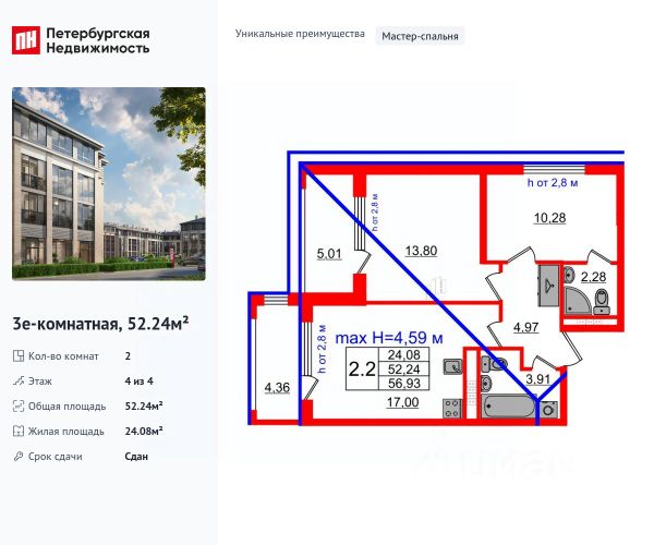 Продается по переуступке современная квартира 3-евро площадью 57.92 кв м, в малоэтажном комплексе в окружении природы и дворцов, рядом с южным побережьем Финского залива, в живописном районе Санкт-Петербурга, город Стрельна, проспект Будённого, дом 18 к1 ст1.